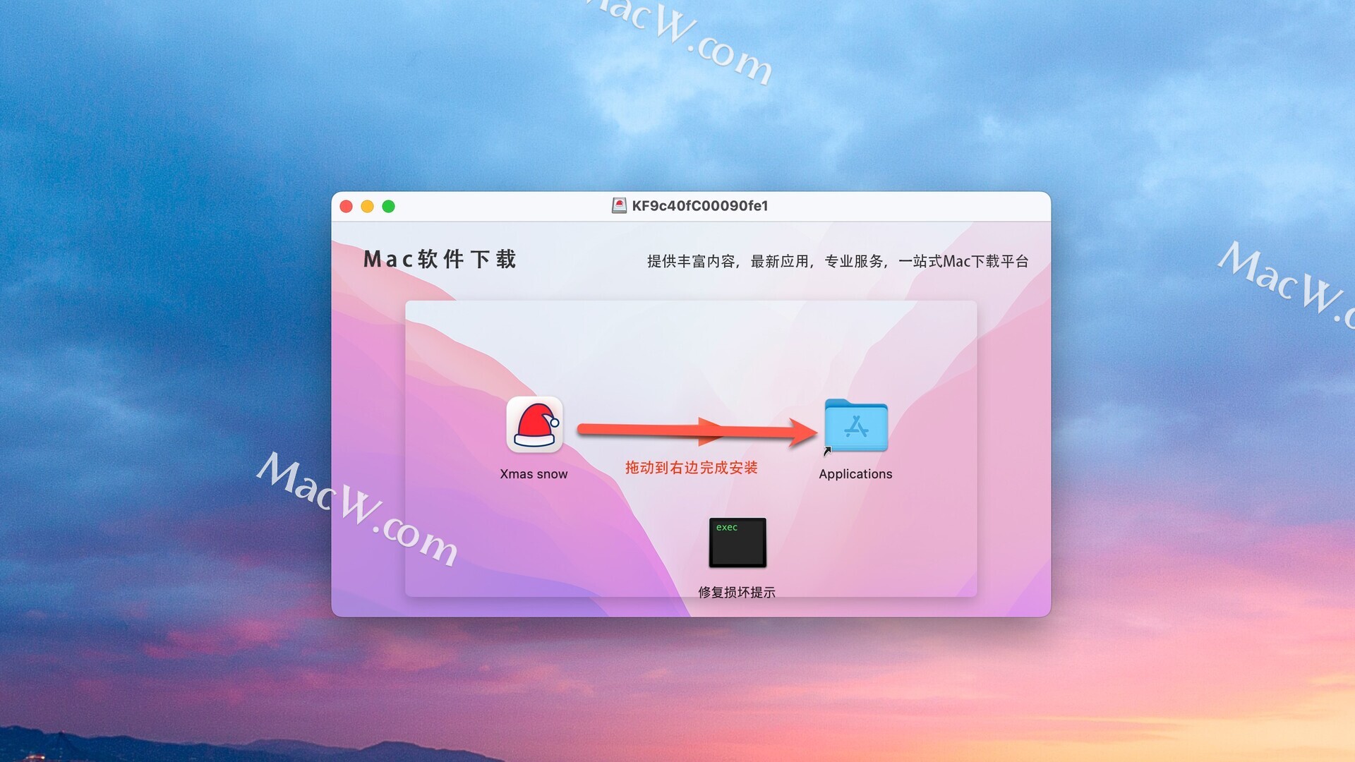 安装包下载完成后,拖动Xmas snow到右侧应用程序中即可。