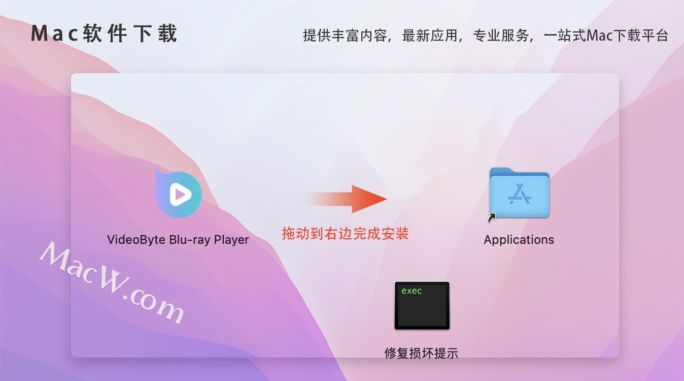 安装包下载完成后,将左侧VideoByte Blu-ray Player拖动到右侧的应用程序中,即可完成安装。