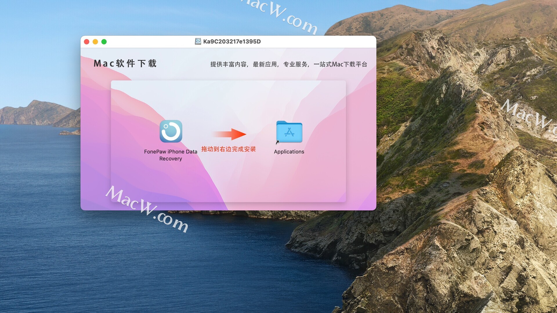 安装包下载完成后,将左侧FonePaw iPhone Data Recovery拖动到右侧的应用程序中,即可完成安装。