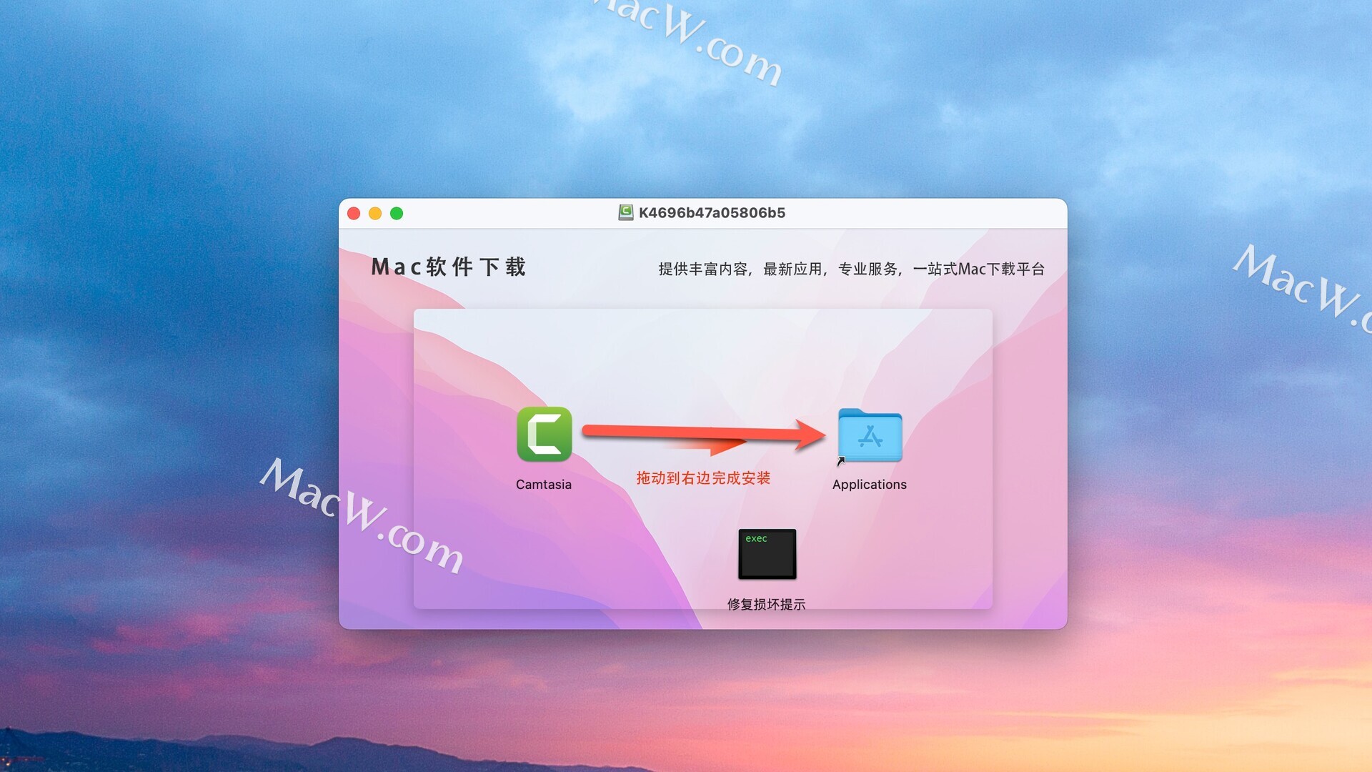 安装包下载完成后,拖动左侧的Camtasia到右侧应用程序中进行安装即可。