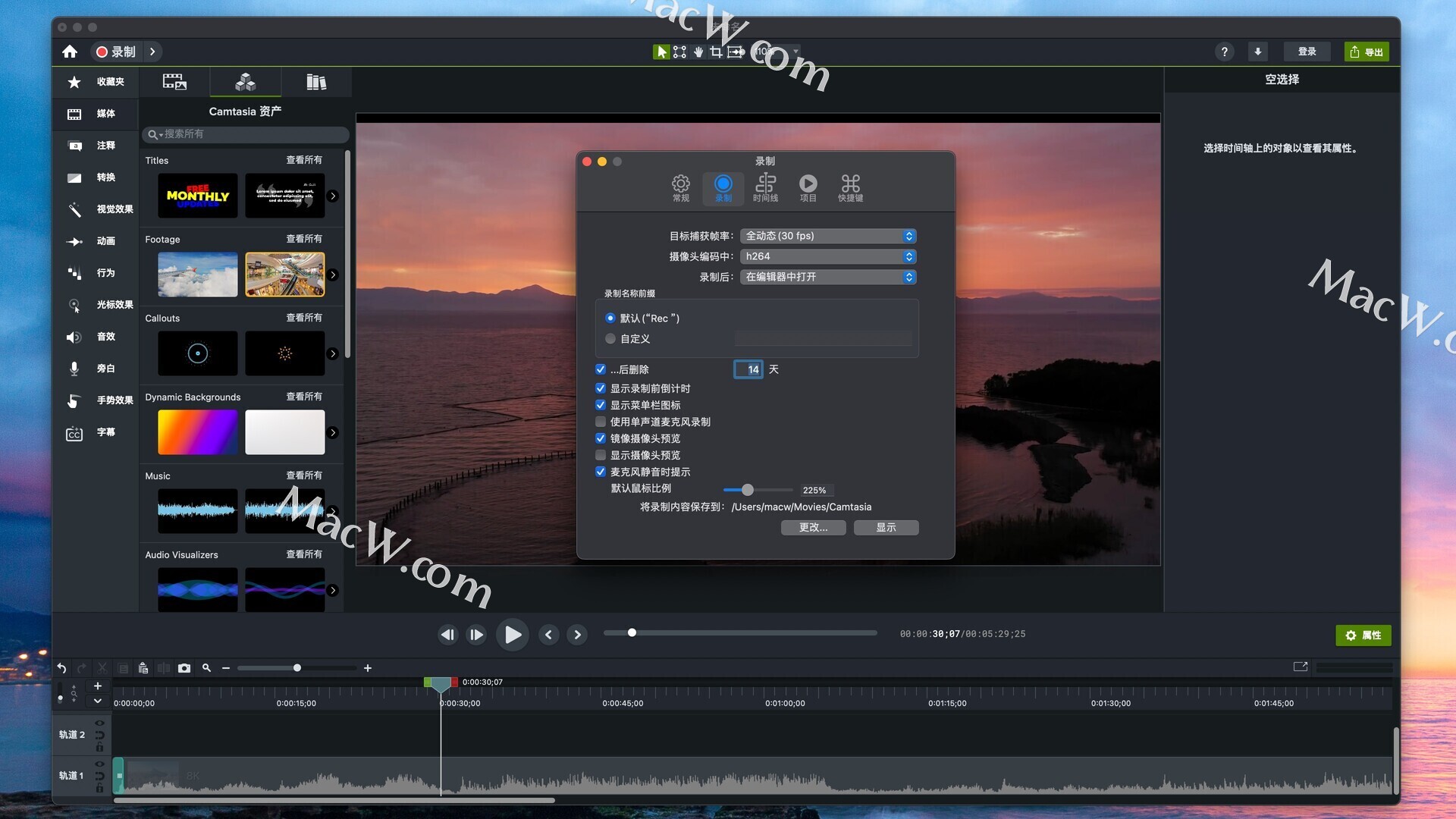 Camtasia 2026 for Mac能够在任何颜色模式下轻松记录屏幕动作,包括影像、音效、鼠标移动轨迹和解说声音等。其直观的界面和丰富的工具让用户能够轻松上手,无论是录制教学视频、演示文稿还是培训课程,都能游刃有余。此外,软件还提供了剪辑、分割、调整视频长度和顺序等视频编辑功能,以及添加文字、标注、箭头、效果和过渡效果等选项,让视频更具专业性和吸引力。