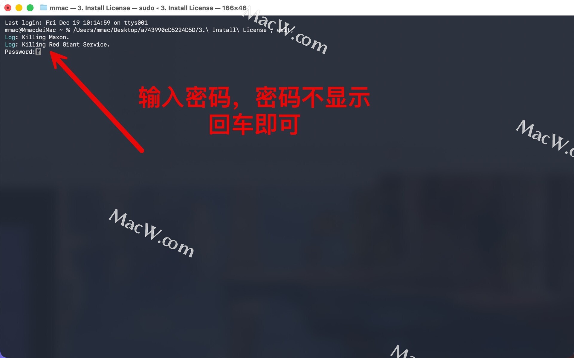 双击安装补丁后,弹出终端页面,在下图位置输入密码(密码不显示回车即可)