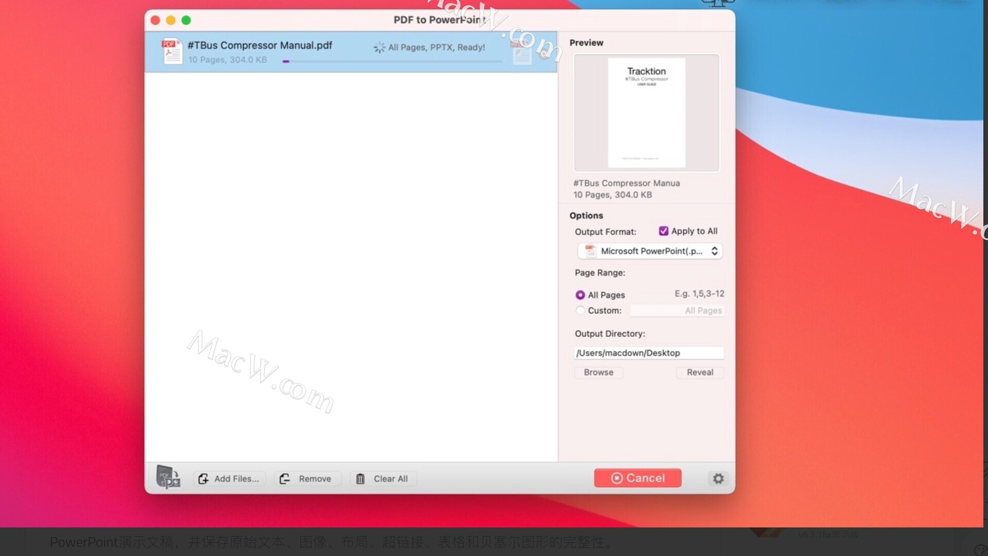 - 它用于将PDF文档转换为Powerpoint文件。您可以获取可编辑的PPT文件,以便在日常工作或学习中进行演示。文本和图像都很好地保留在输出文件中。一站式转换可以节省您的时间,因此您无需花费大量时间将其他文档中的文本键入,复制和粘贴到PPT文件中。转换后,ppt文件将内容保留在原始PDF文件中,几乎不需要手动调整。