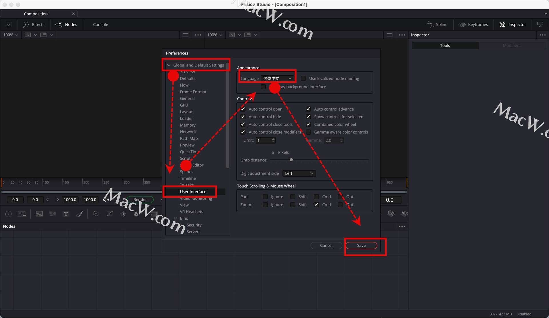 在弹出的窗口左侧展开Global and Default Settings-User Interface-Language-简体中文 再点击“Save”,OK。
