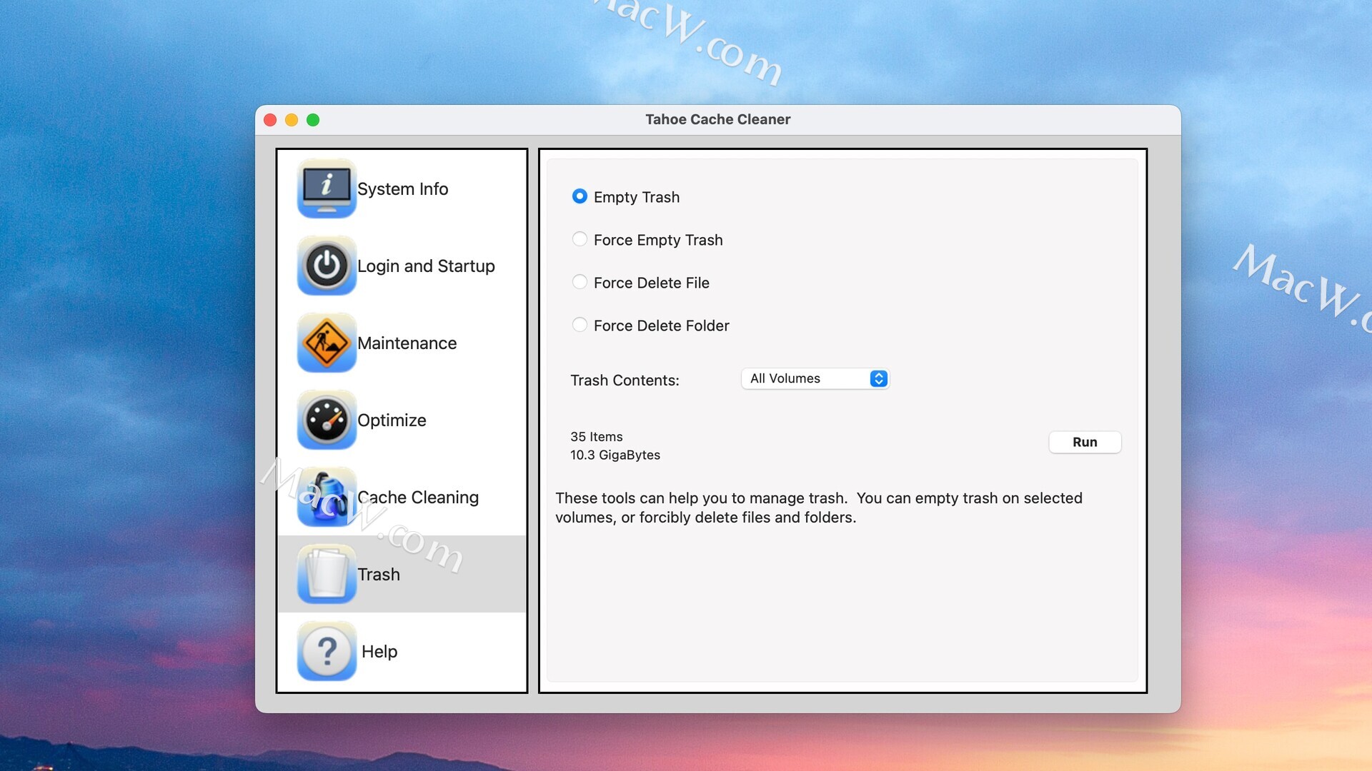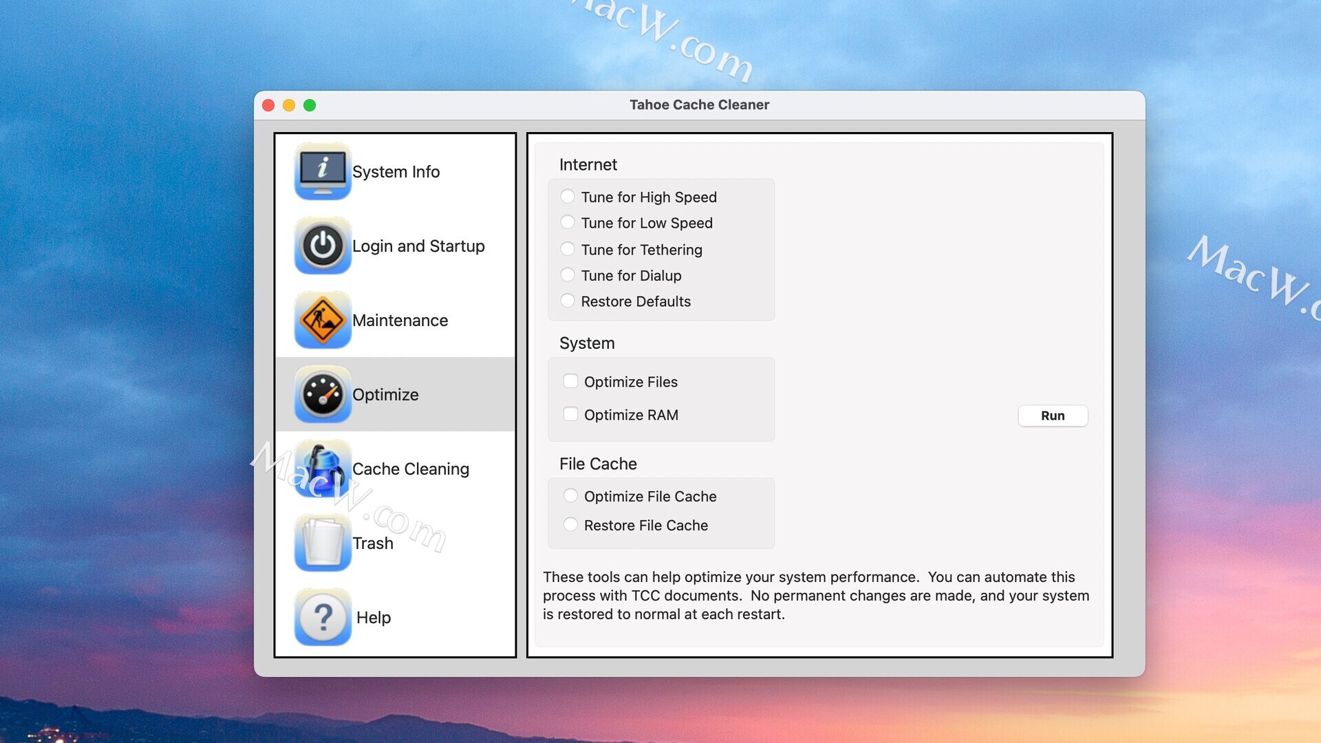 Tahoe Cache Cleaner 可以通过调整网络和文件缓存设置、启用 RAM 磁盘以及清理各种缓存和过期数据来提升系统性能。TCC 还包含用于优化文件和内存的工具。 TCC 可以通过删除语言本地化文件和精简通用二进制文件来回收浪费的磁盘空间。