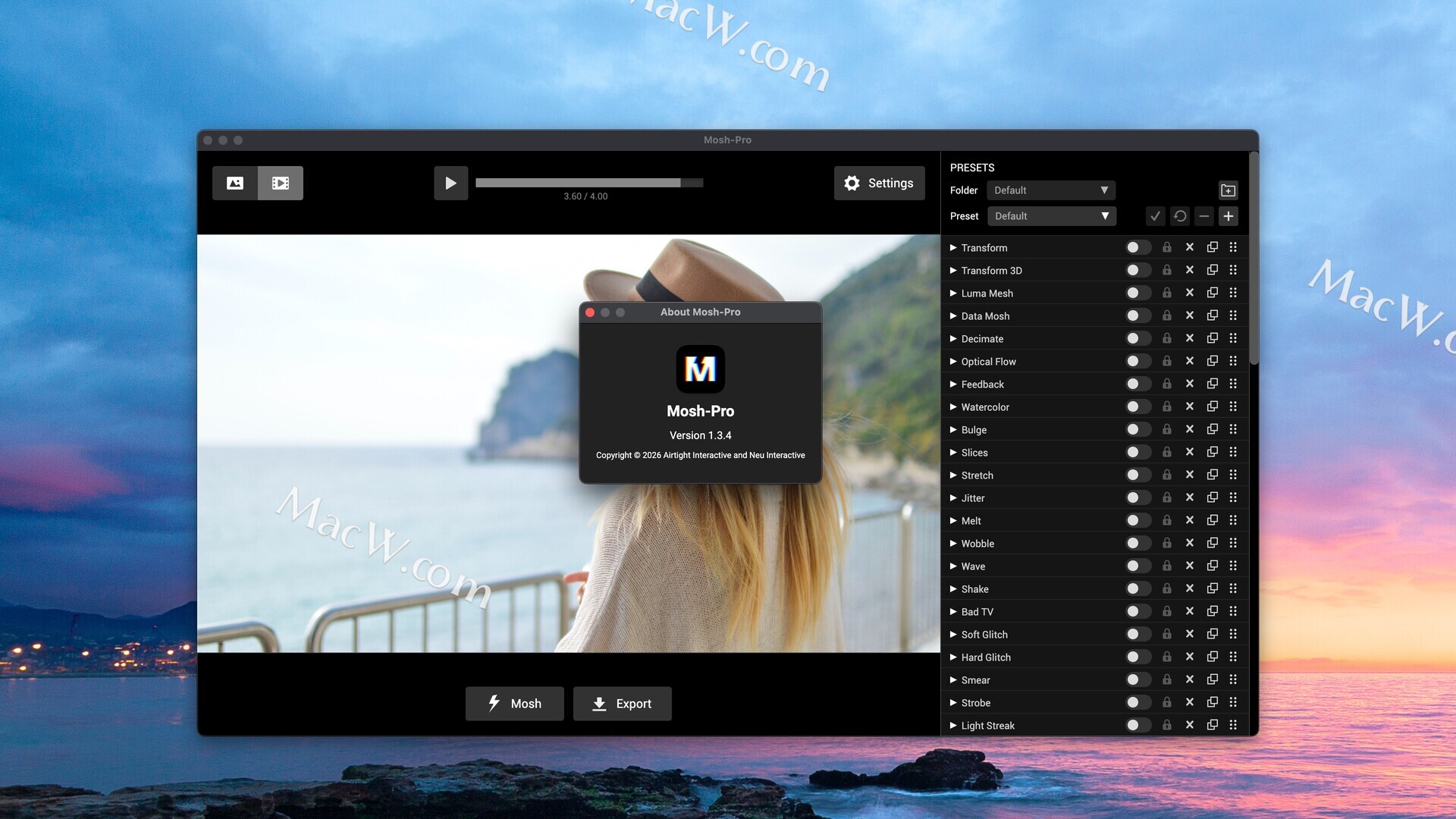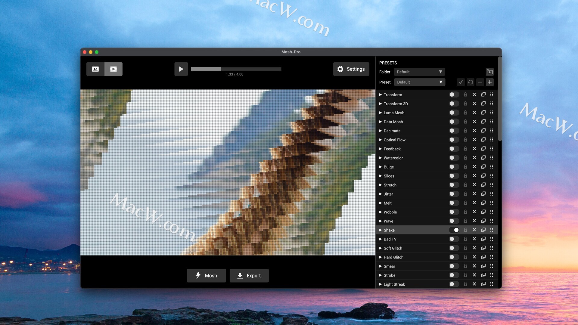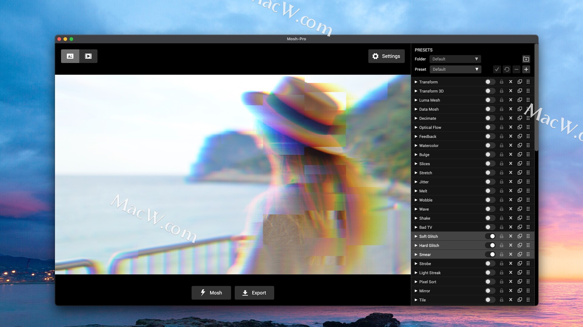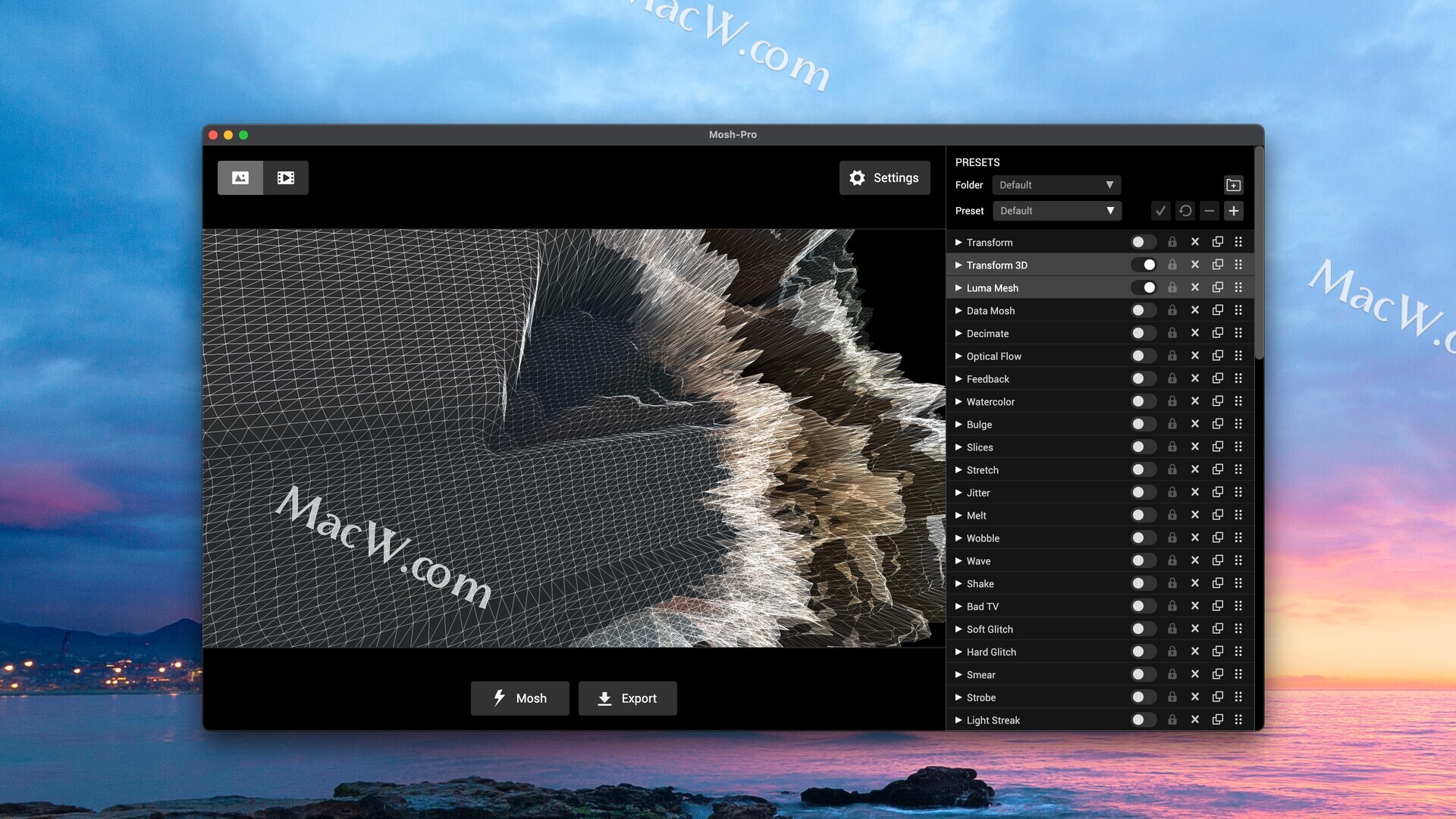 Mosh Pro 是一款功能齐全的桌面应用程序,提供实时视觉特效混合器,可对图像、视频和 GIF 进行无限的创意控制。60多种特效,可堆叠和重新排列,实现无限组合。专为最大限度地发挥图像和视频创意而设计。
