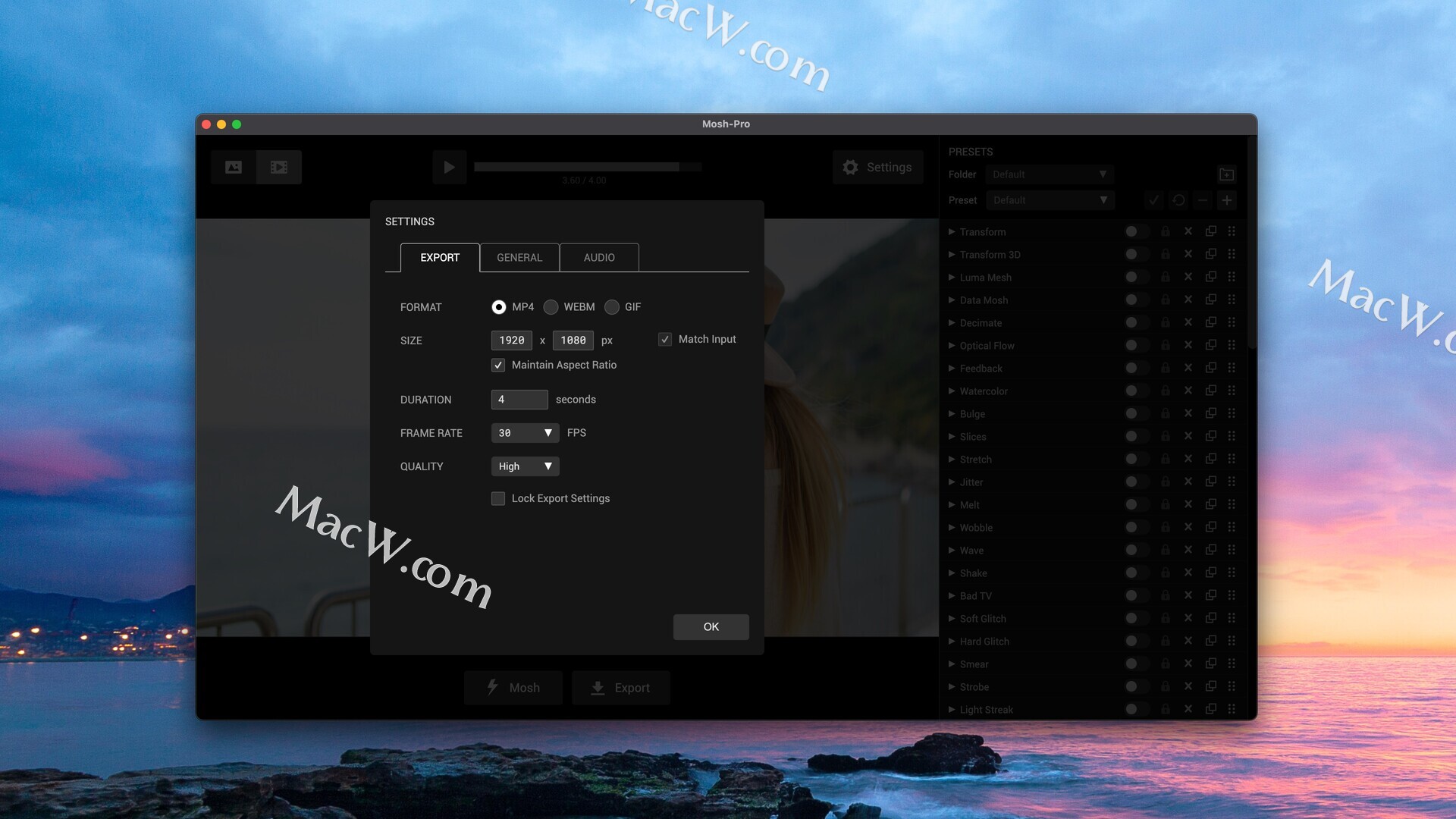 Mosh-Pro 拥有强大的自定义导出引擎,可对输出媒体进行全面控制。您可以控制输出尺寸、时长、帧速率和文件类型。