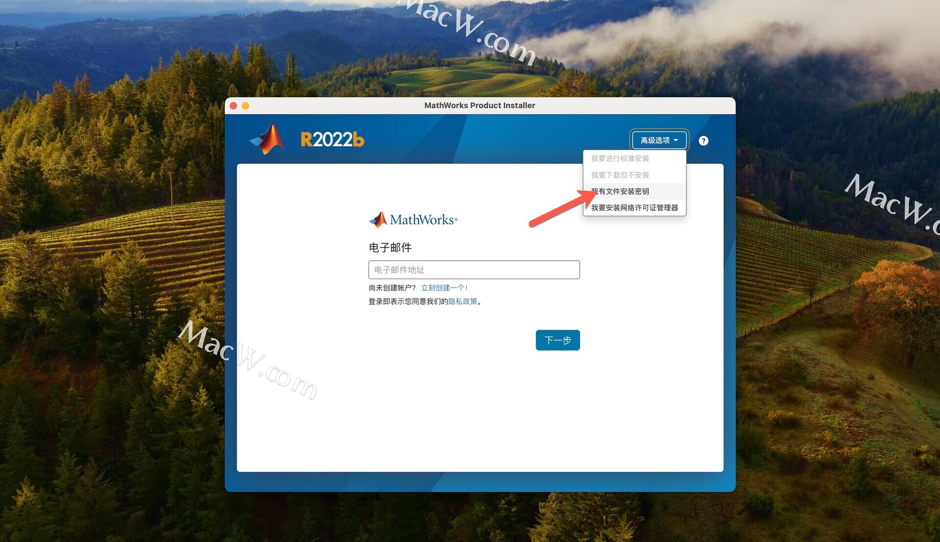 2.弹出一个MATLAB安装程序,在高级选项里选择我有文件安装密钥