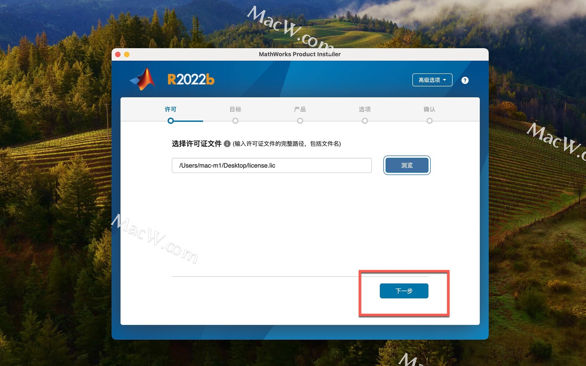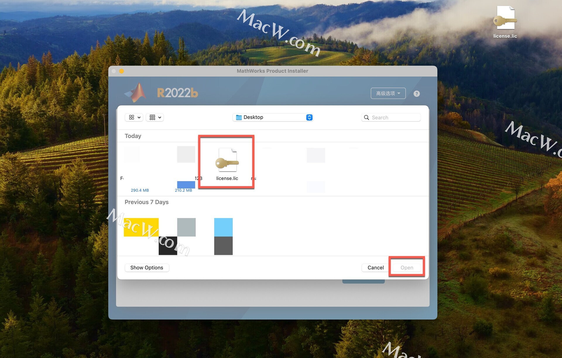 6.点击浏览,选择刚才拖到桌面的桌面的license,点击open