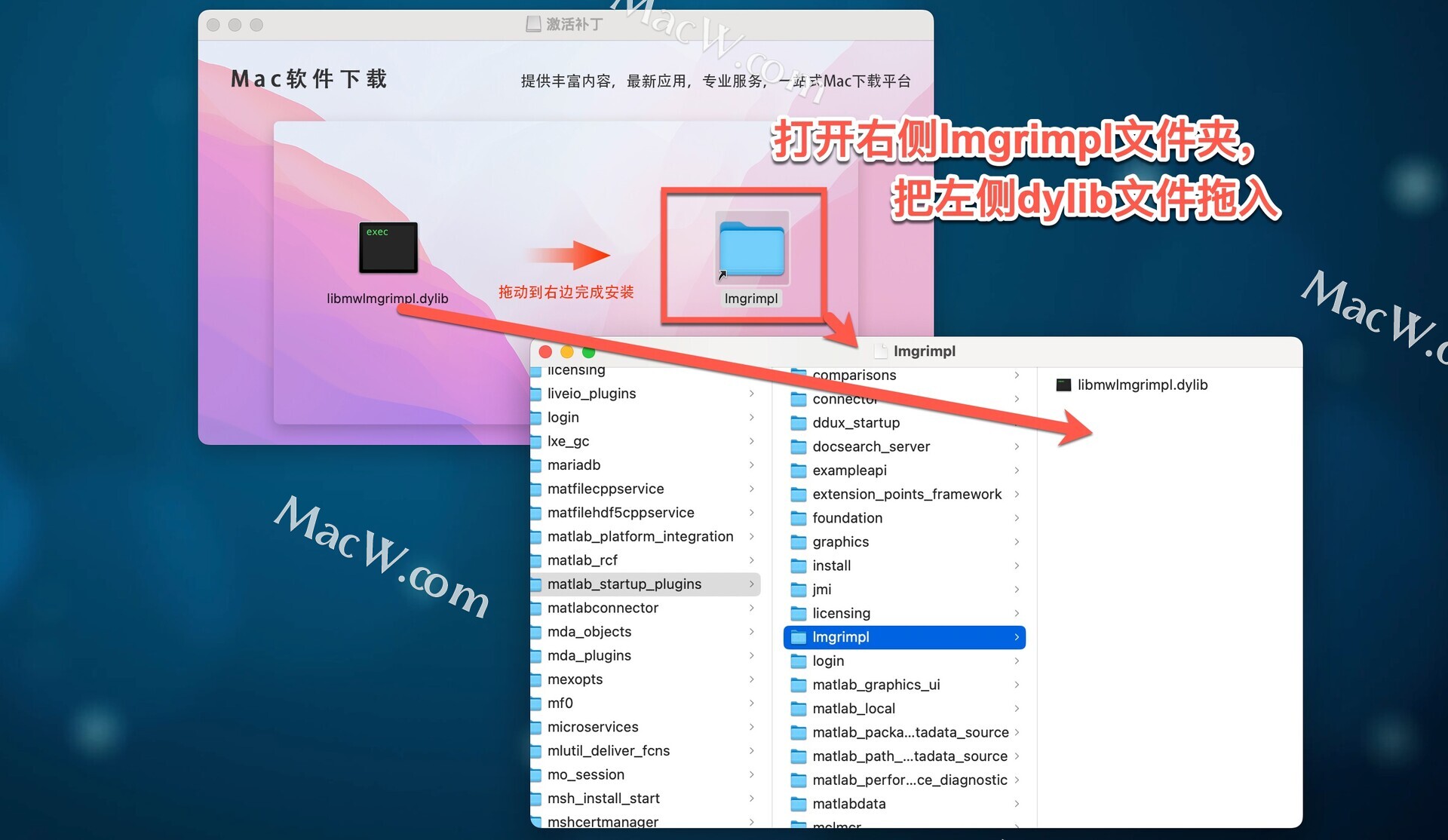 14.将左侧的libmwservices.dylib拷贝到lmgrimpl文件夹,点击替换。如果没有弹出询问是否替换的窗口,或者不确定是否替换成功,则按照下图方式,打开右侧lmgrimpl文件夹,把左侧dylib文件拖入