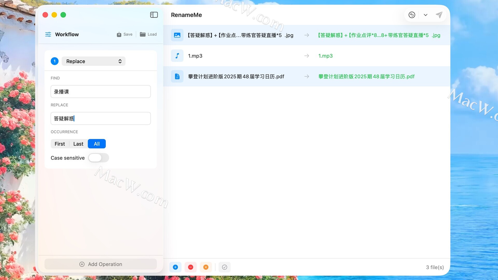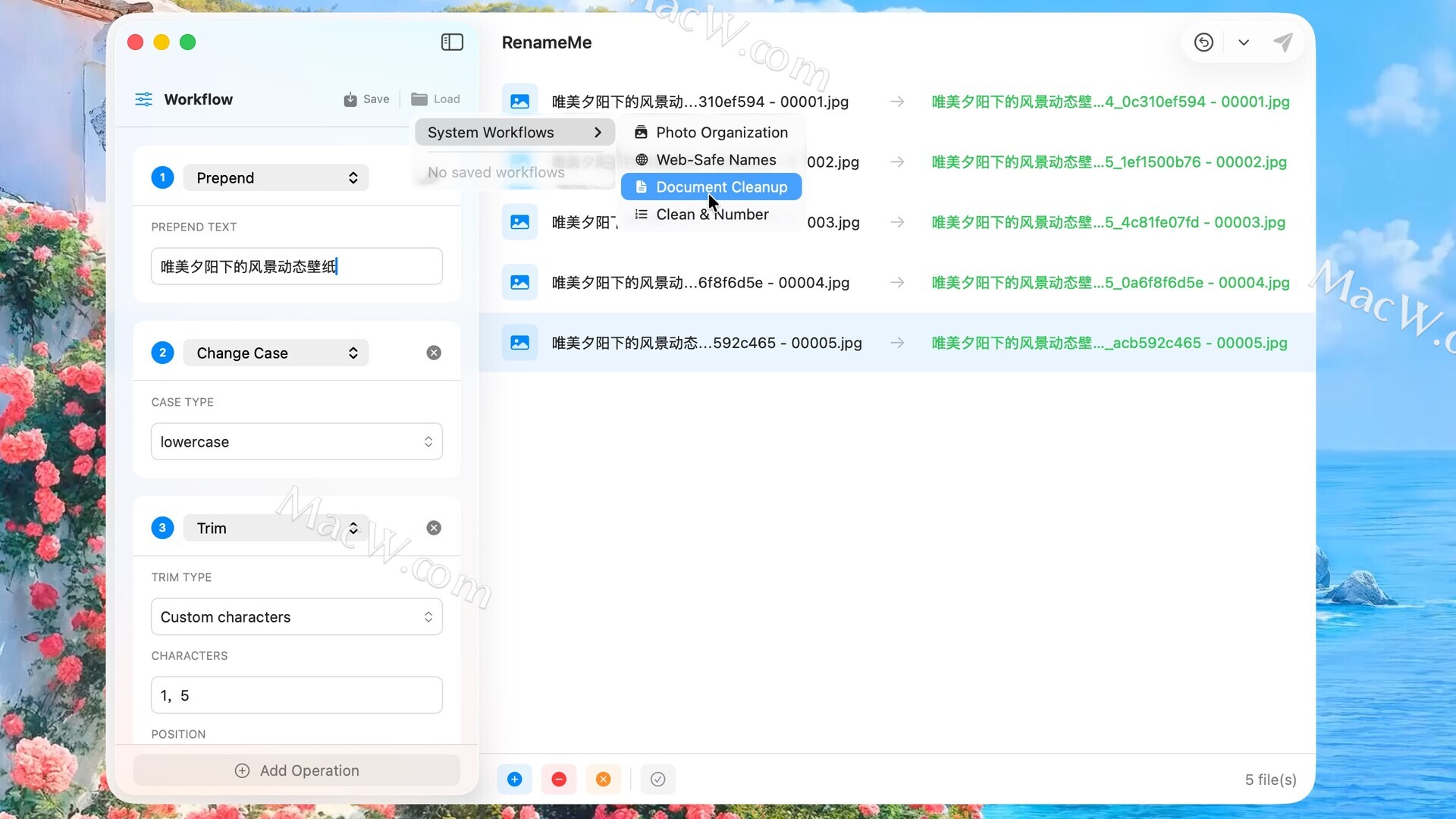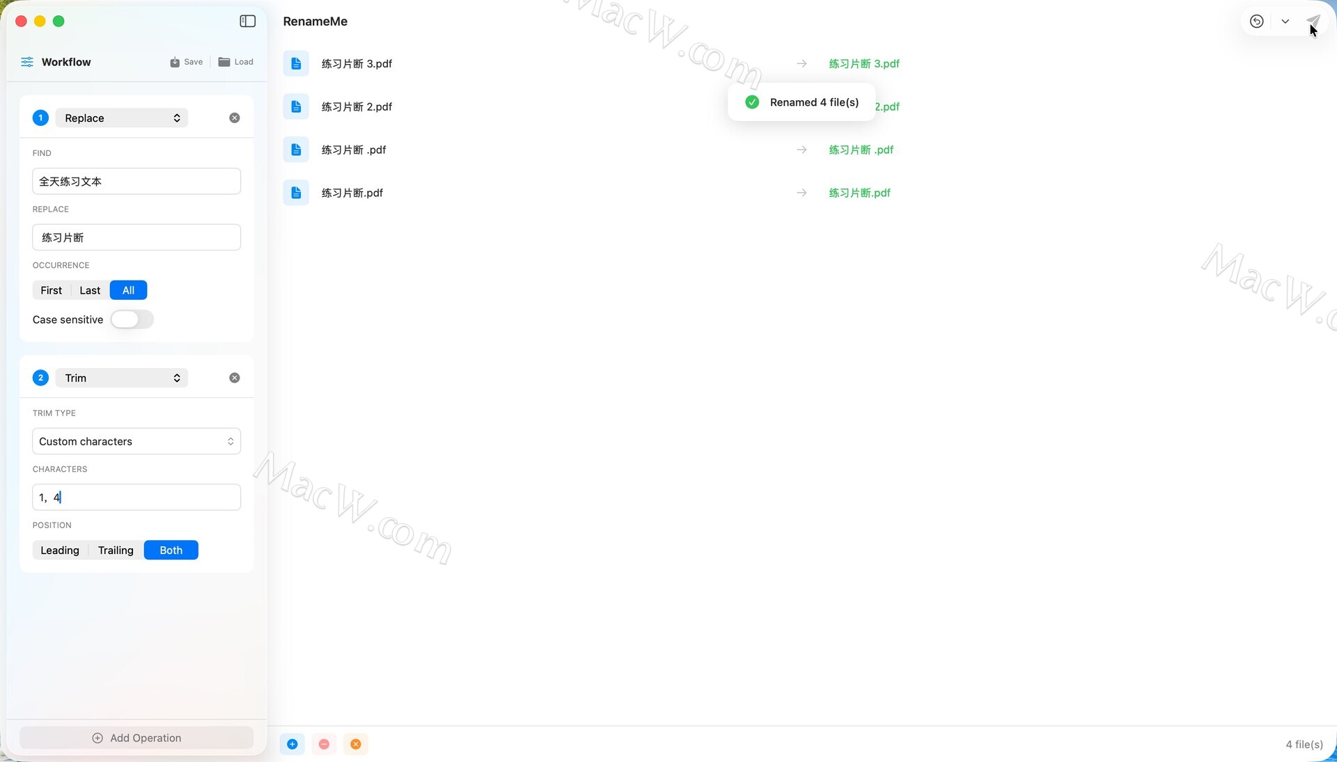 - 将多个重命名操作串联起来。在一个工作流程中即可完成替换文本、更改大小写、添加前缀、修剪字符等操作。
