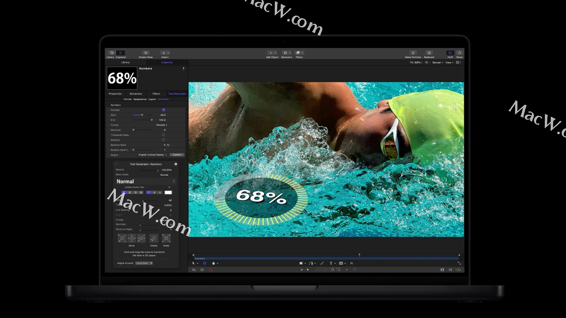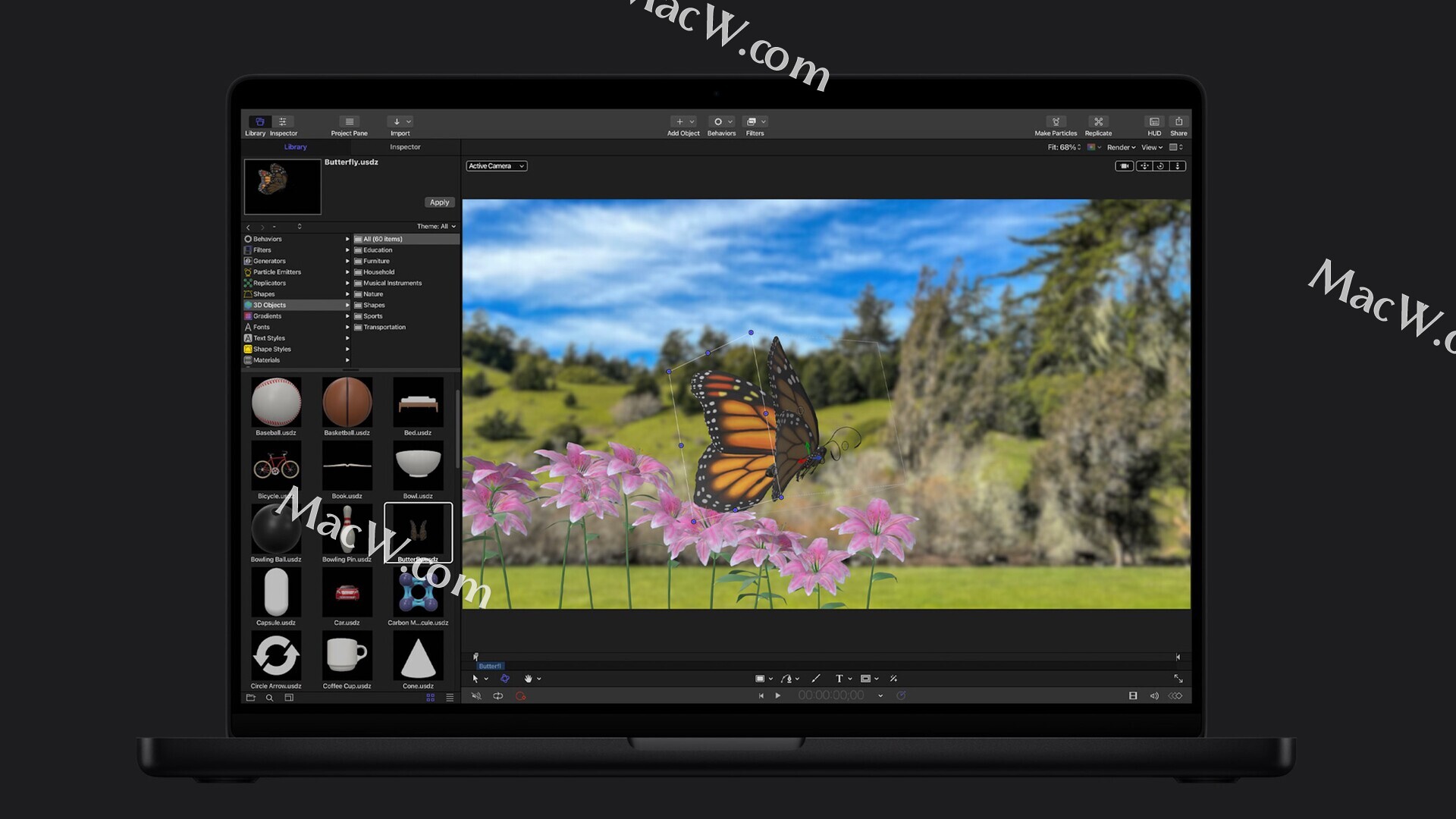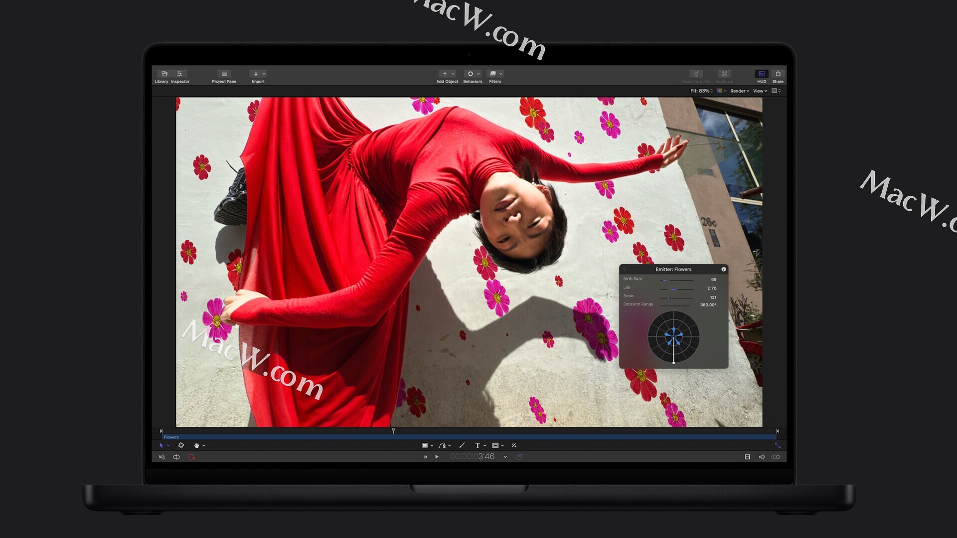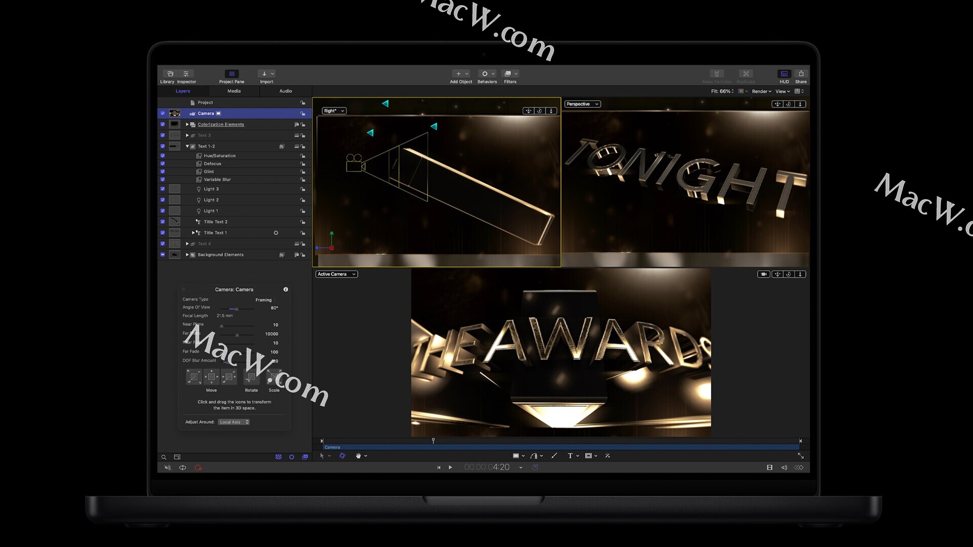 使用Motion可以轻松设计大片级的 2D、3D 和 360° 字幕、流畅的转场和逼真的特效,实时出效果。Motion 更专为 Apple 芯片和神经网络引擎优化,让你能以惊人的速度和准确度创建、播放绚丽的影像。