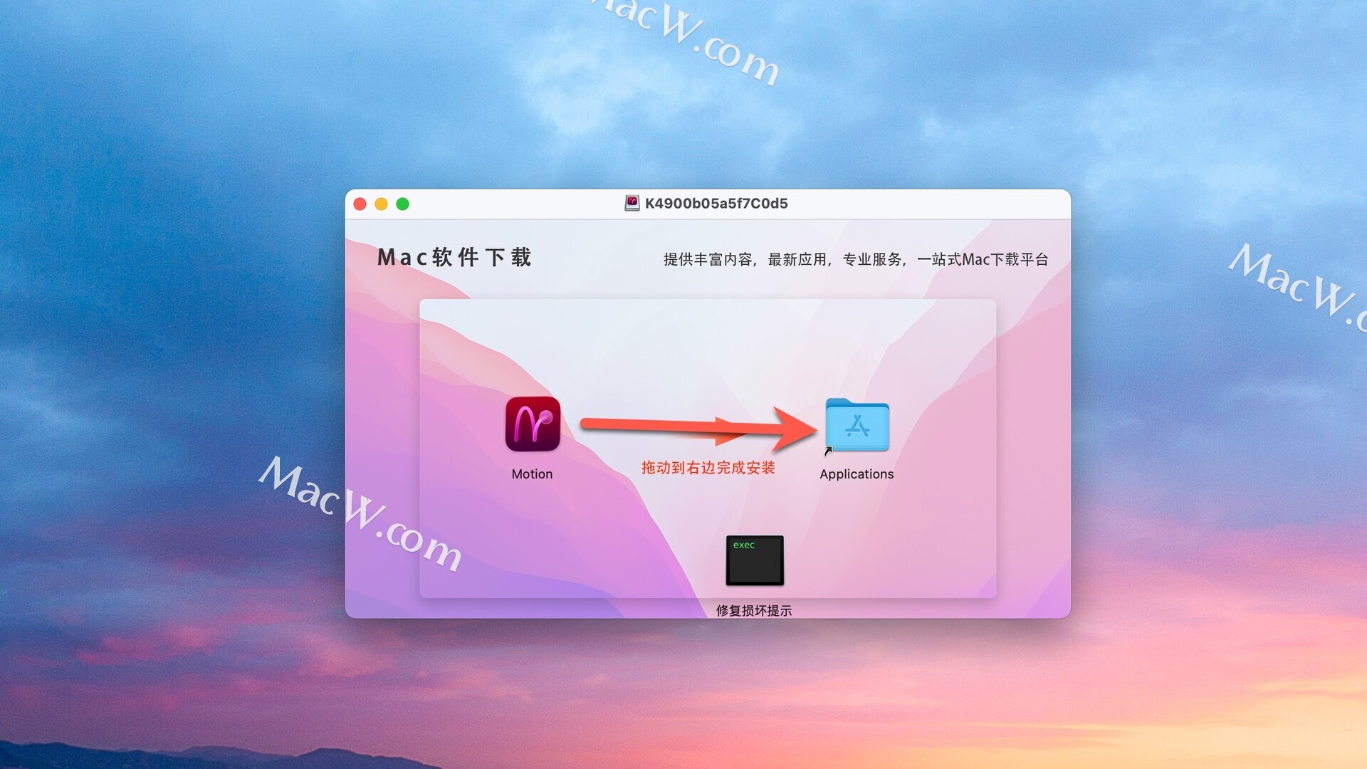 Motion 需要 macOS 15.6 或更高版本。安装包下载完成后,将左侧程序拖动到右侧文件夹即可
