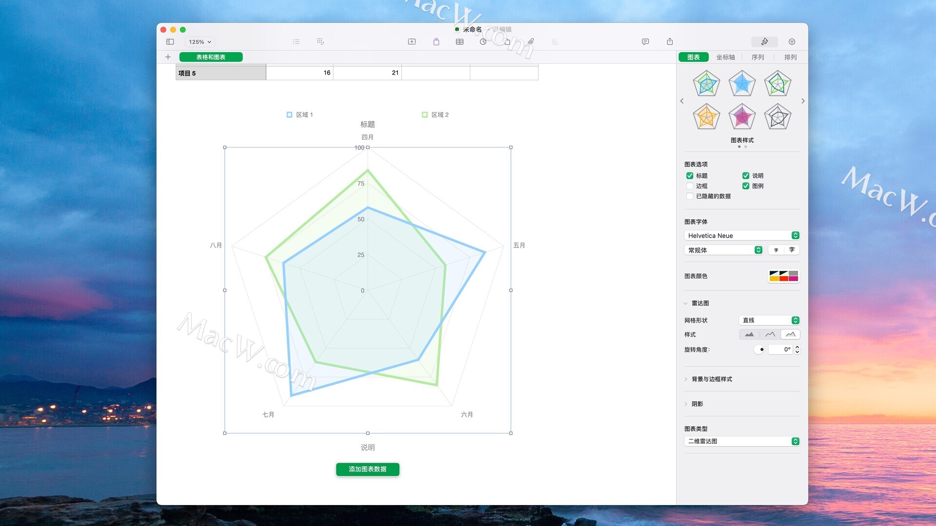 • 插入精美的 2D 和 3D 图表,包括条形图、柱形图、折线图、面积图、饼图等环形图和雷达图