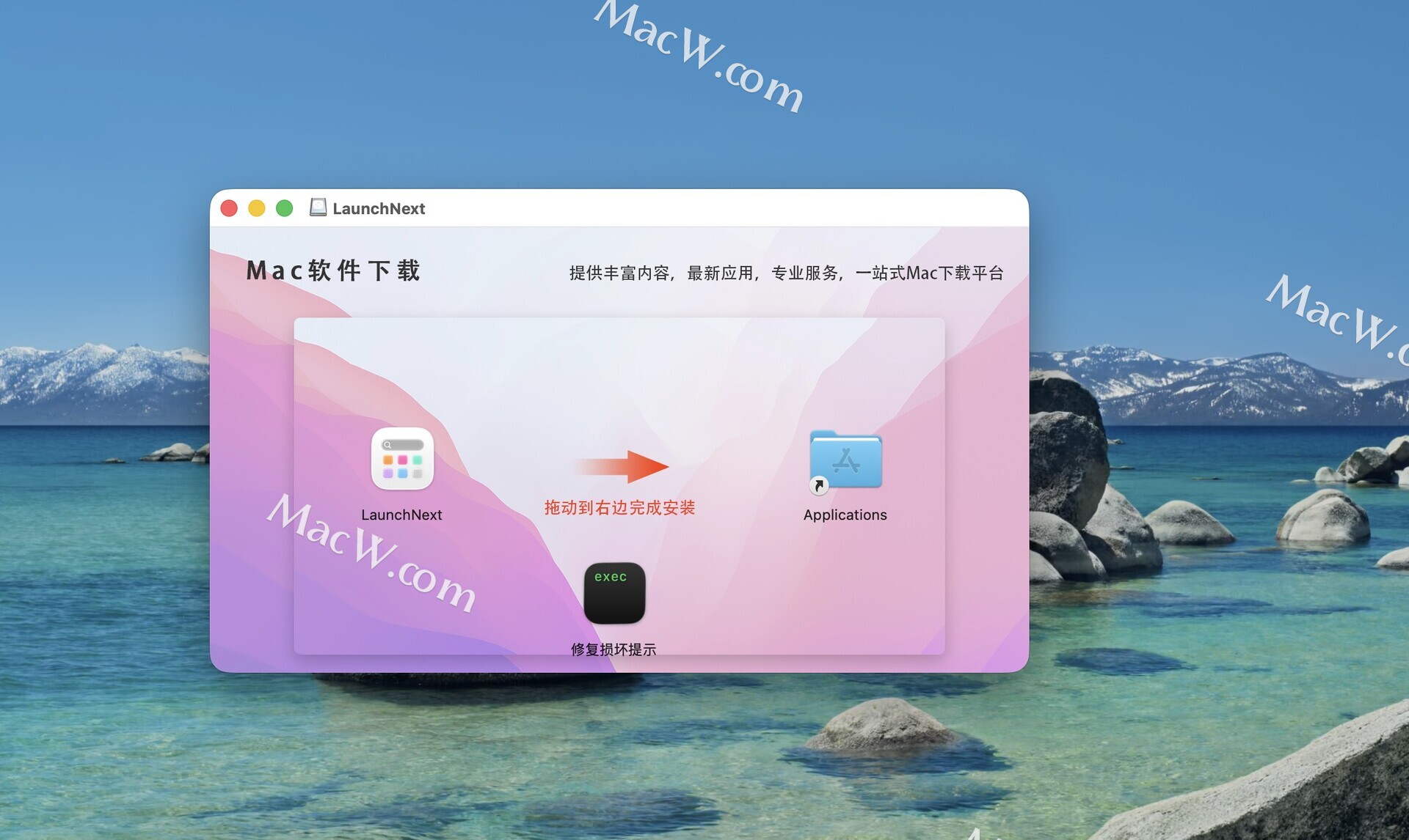 下载完成后,把左侧LaunchNext软件拖动到右侧文件夹即可。