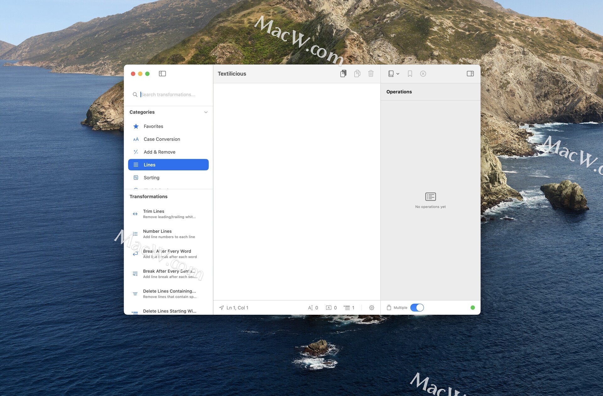 Textilicious 是一个强大的 Mac 本地文本转换工具,专为速度和精度而设计。它包含 6 个类别中的 50 多种操作,可以将它们链接成可重复使用的食谱,并实时查看结果更新。它具有内置编辑器、实时统计和完整的撤销历史记录,将重复的文本任务变成一键工作流程。