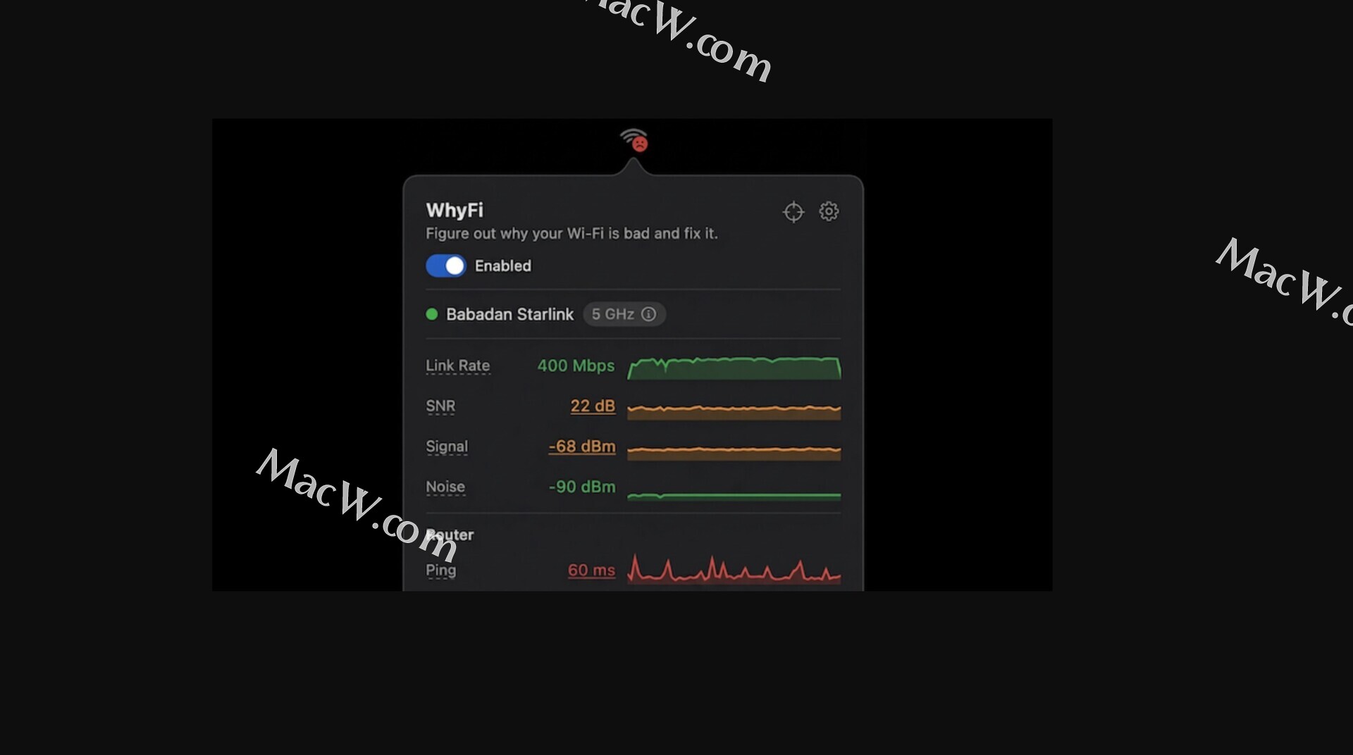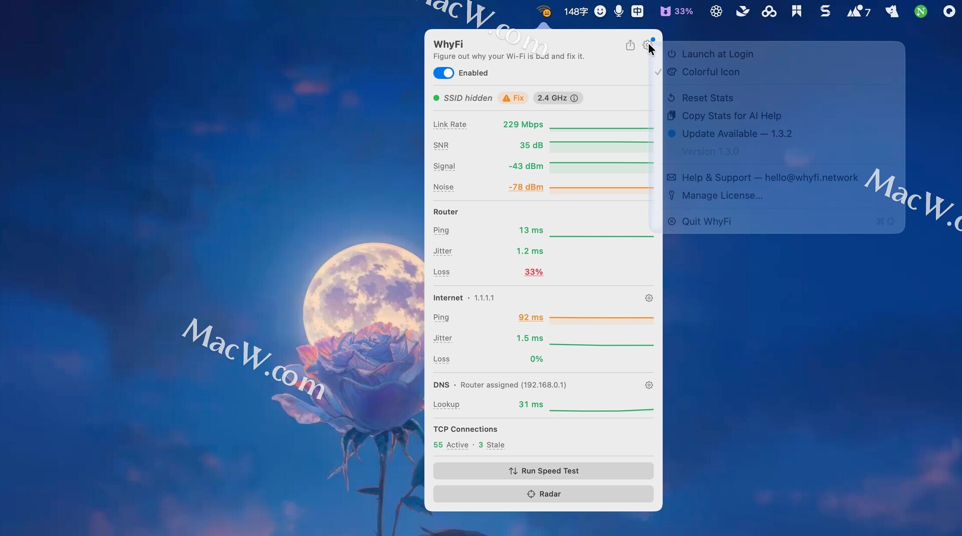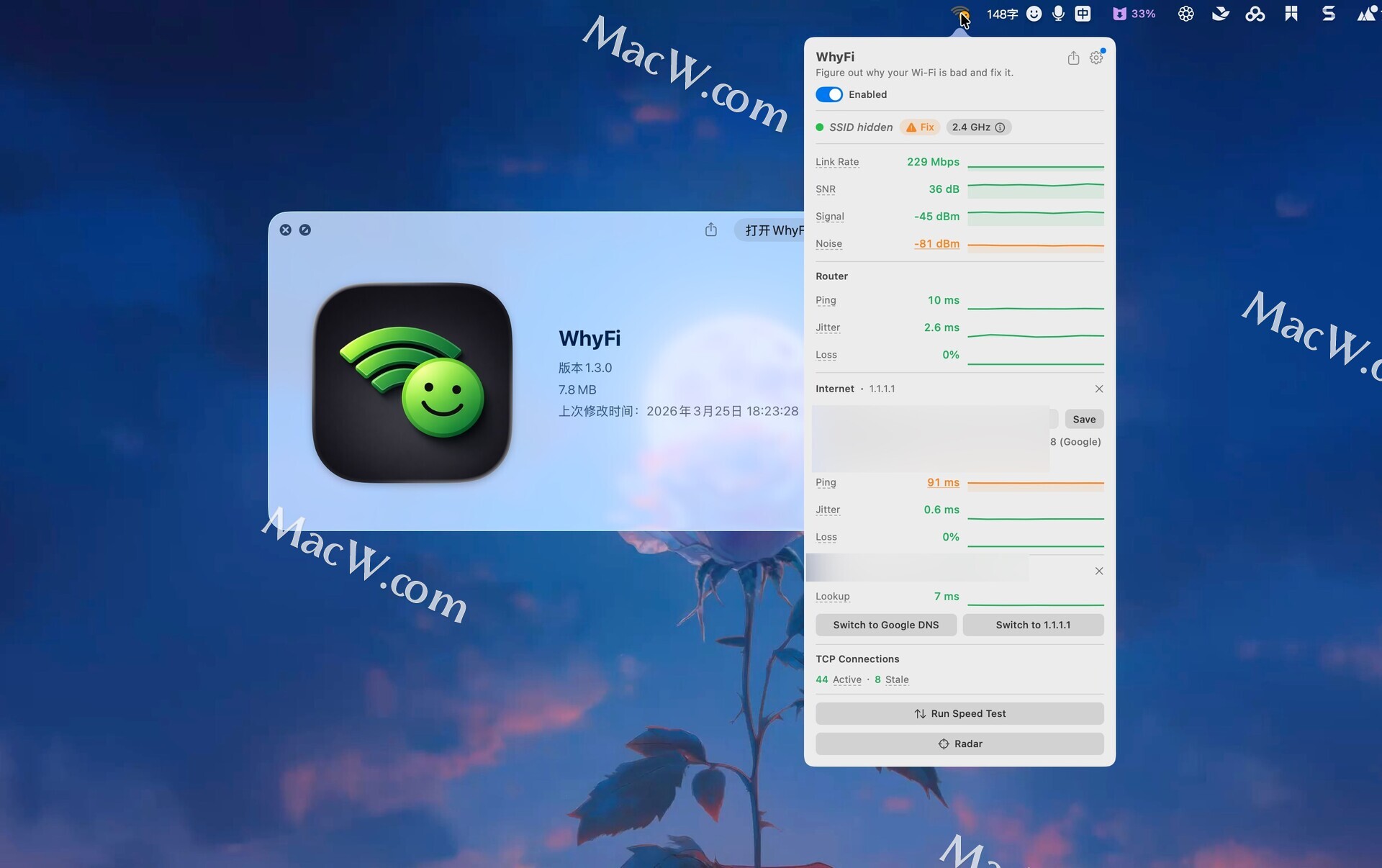 WhyFi 常驻 macOS 菜单栏,持续监控您的 Wi-Fi 网络。它可以测量信号强度、路由器延迟、网络质量和 DNS 设置。当网络速度变慢时,它可以帮助您找出问题的根源并找到解决方法。