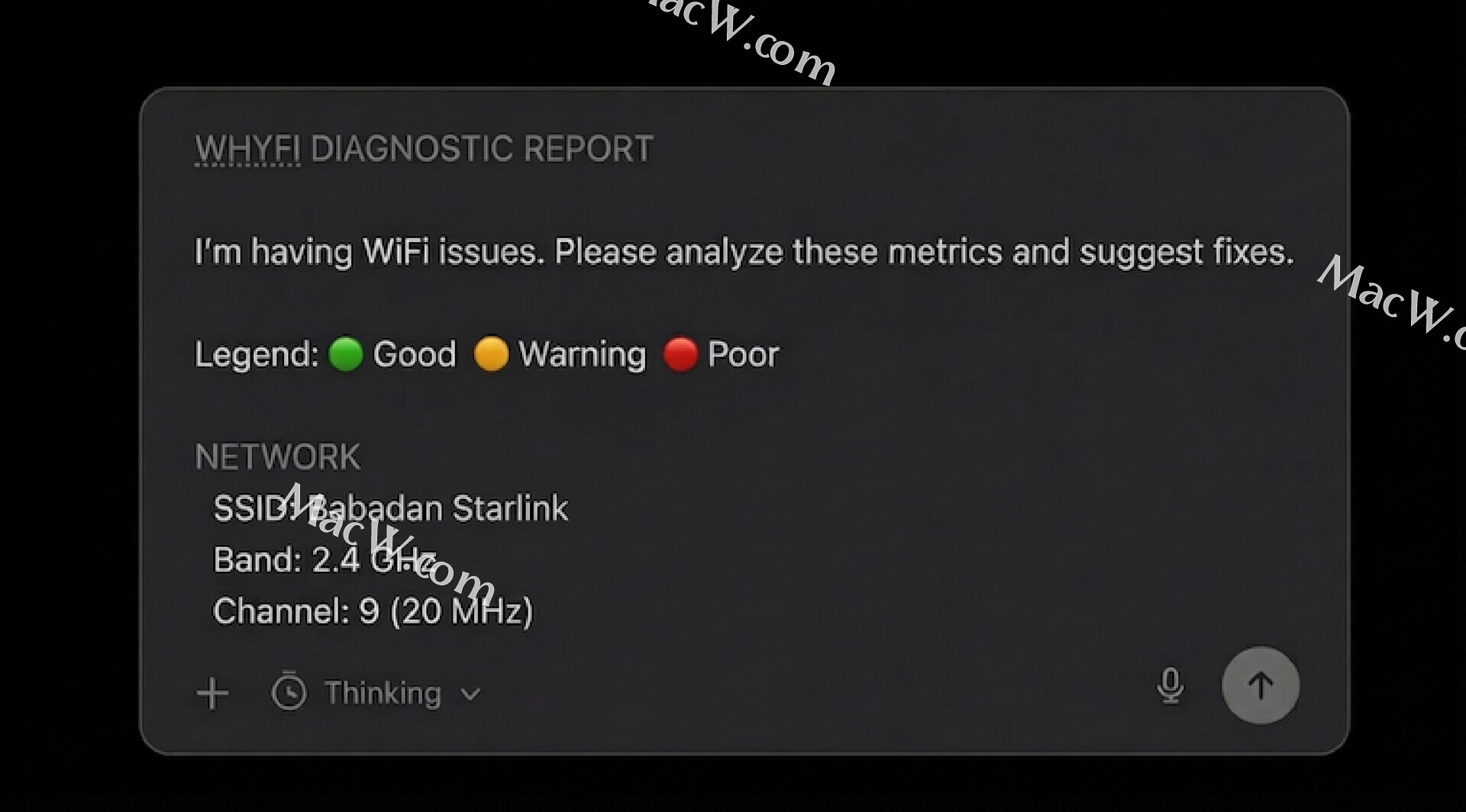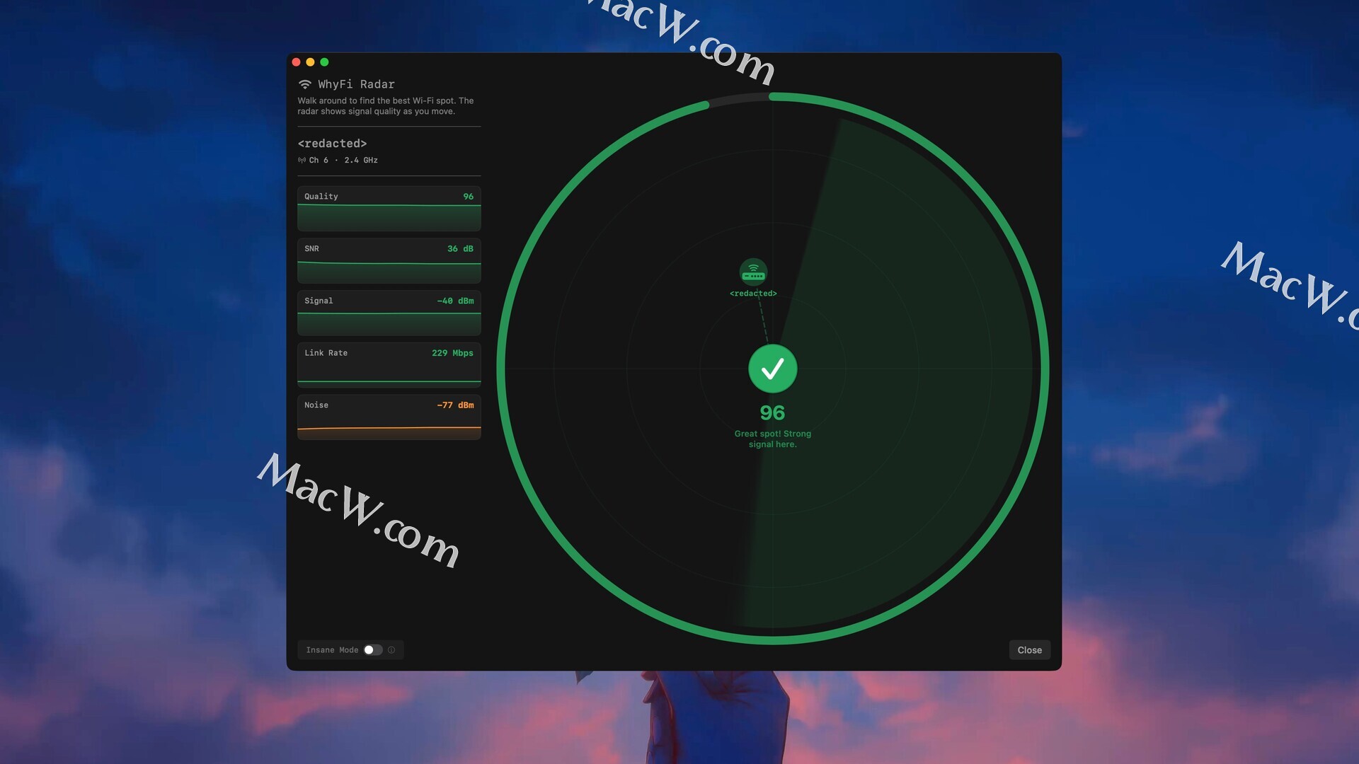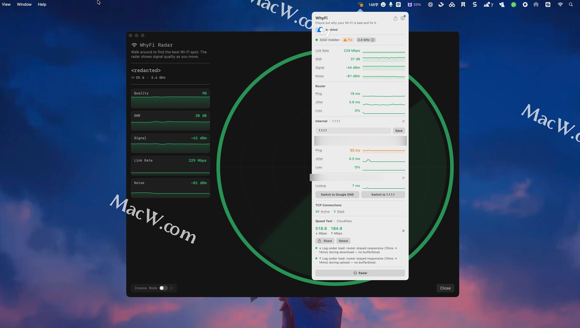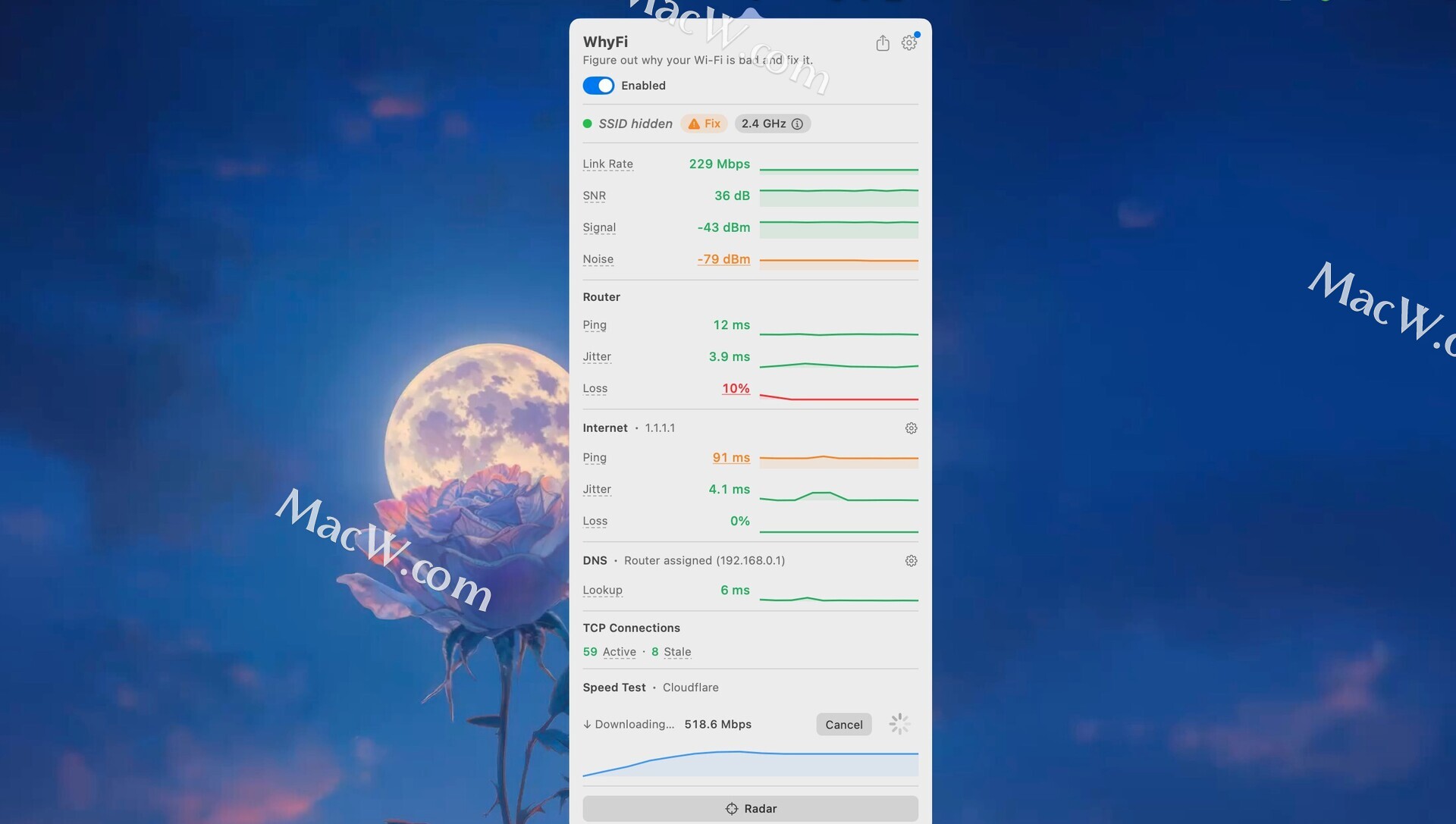 WhyFi 常驻 macOS 菜单栏,持续监控您的 Wi-Fi 网络。它可以测量信号强度、路由器延迟、网络质量和 DNS 设置。当网络速度变慢时,它可以帮助您找出问题的根源并找到解决方法。