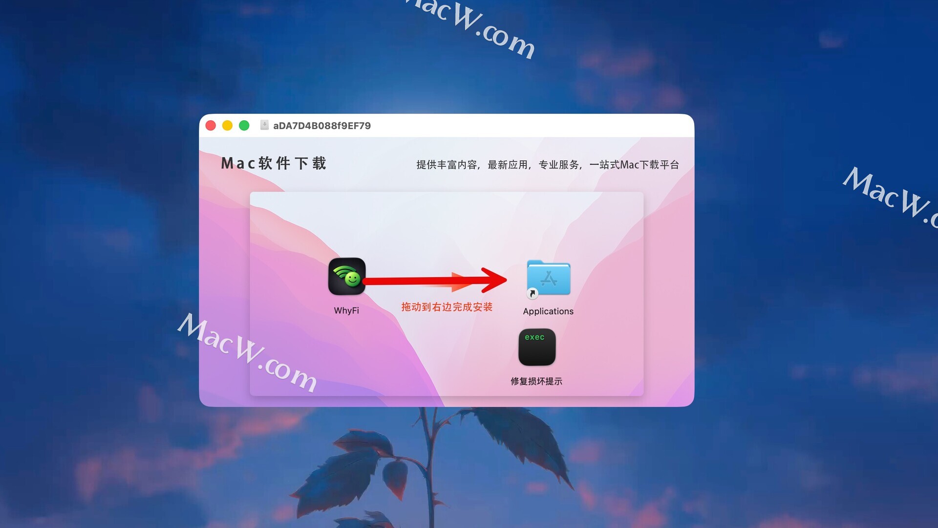 将左侧的WhyFi拖动到右侧的应用程序中即可,如图