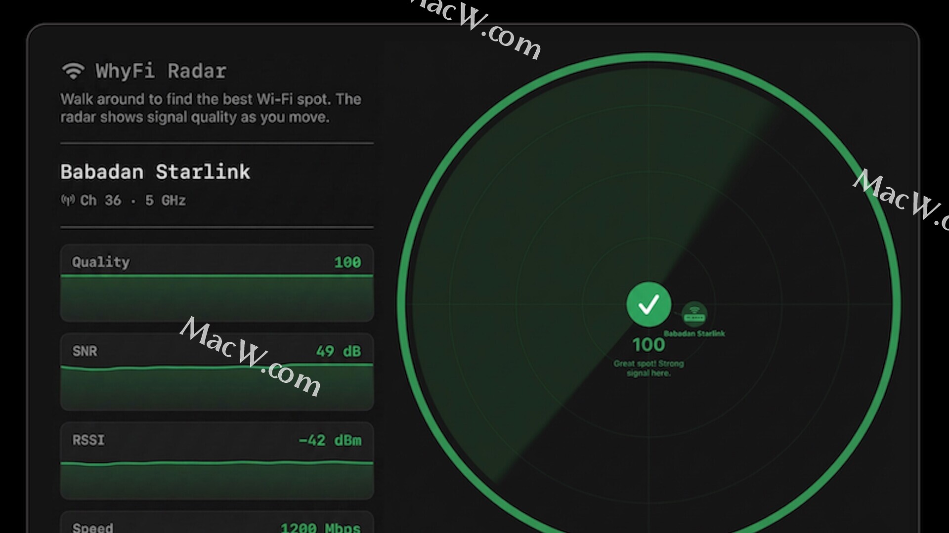 一款实时信号监测器,每秒更新 4 次。带着笔记本电脑四处走动,它就能告诉你信号最强的位置。它会显示 0 到 100 的分数,并喊出“继续前进”或“返回”,让你无需猜测。