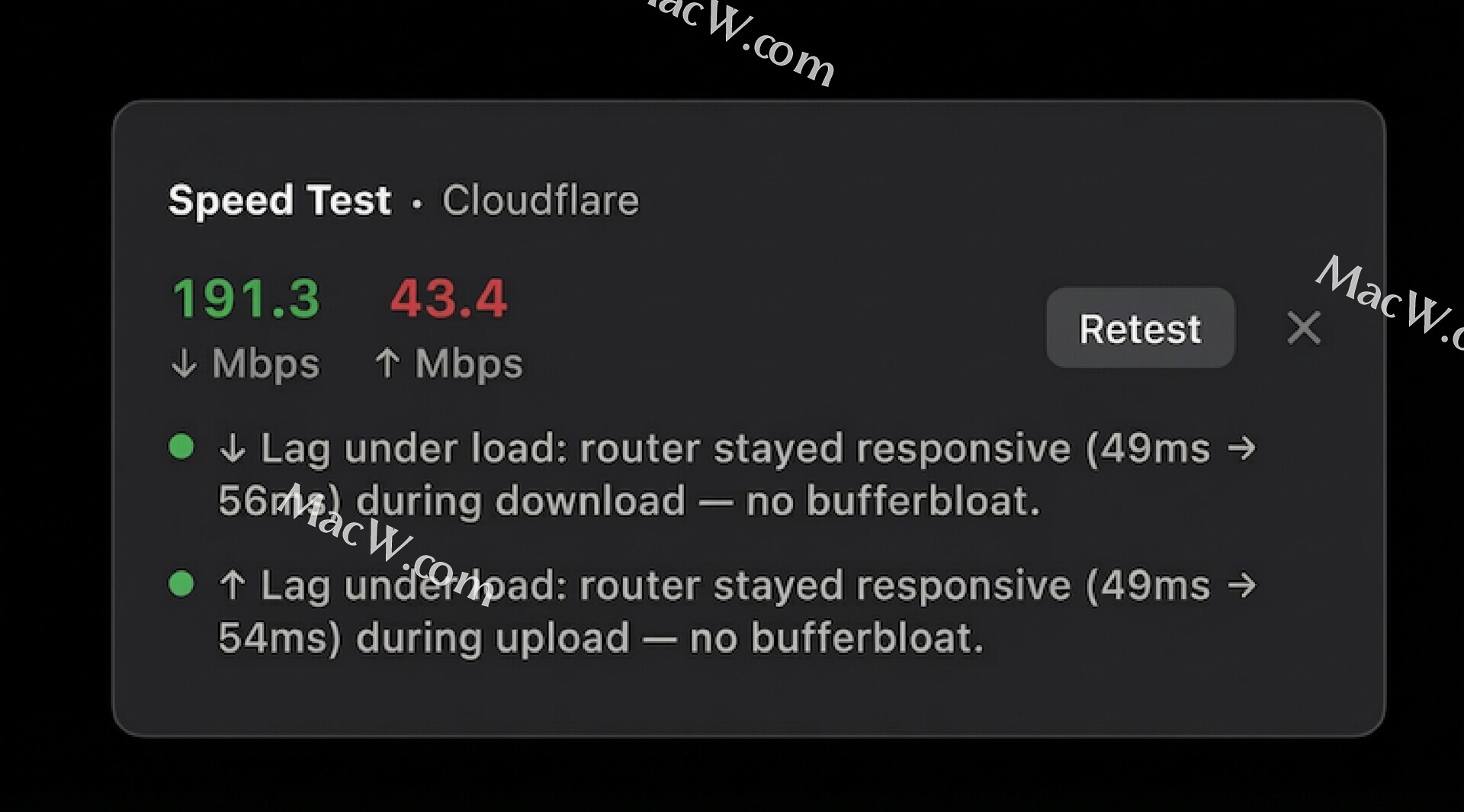 - 通过 Cloudflare 测试下载和上传速度,以及负载下的延迟。所有操作均可在菜单栏完成。它会告诉你视频通话期间连接是否会中断(这就是所谓的缓冲膨胀)。