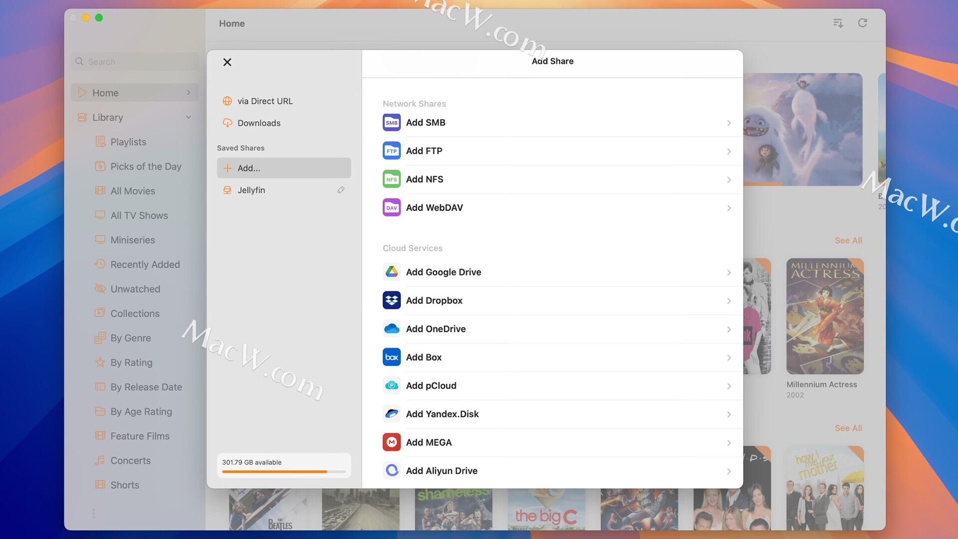 - 浏览和播放存储在 Mac、PC、NAS、Wi-Fi 硬盘驱动器、Plex、Emby 和 Jellyfin 等应用程序或来自 Dropbox、Google Drive、OneDrive、Box、pCloud、Yandex 等云服务的视频.Disk 和 Mega.nz – 无需同步!