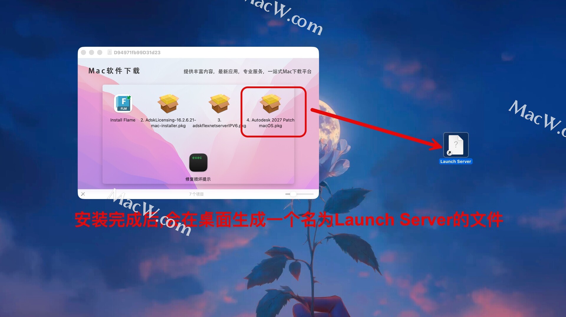 注意:激活补丁Autodesk 2027 Patch macOS.pkg安装完成后,会在桌面生成一个名为Launch Server的文件,如图