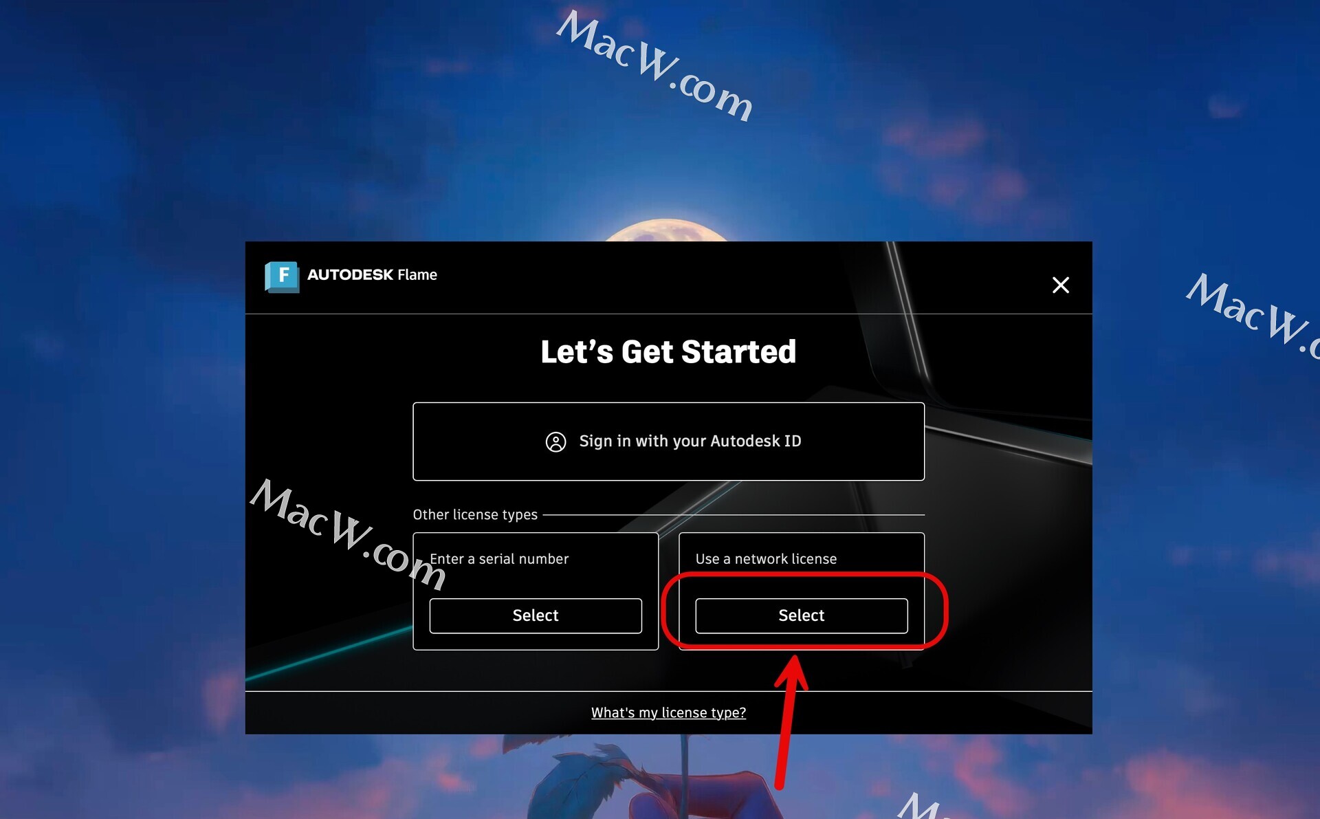 在右侧面板中找到 Use a network license (使用网络许可)并点击 Select (选择)。