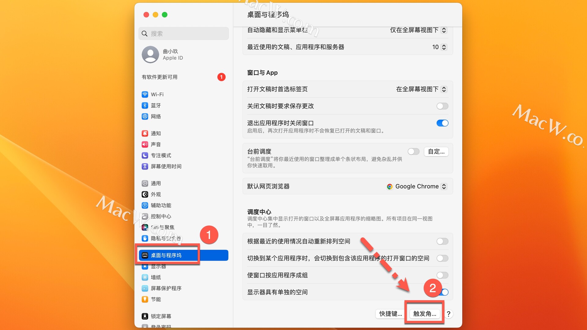 点按边栏中的“桌面与程序坞”,点击右侧的“触发角”进入