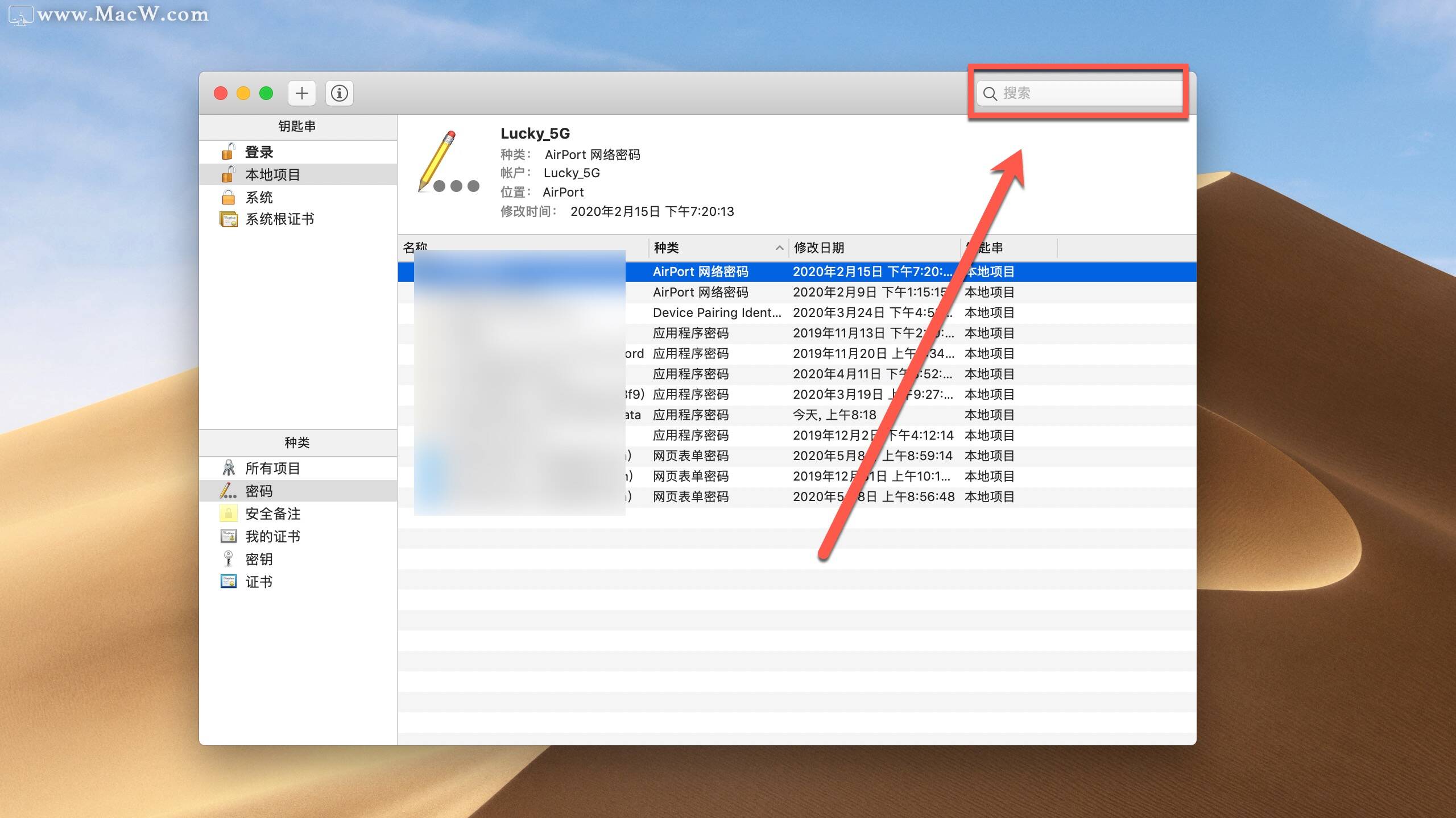如果你保存的密码实在太多,查找起来太费劲,你可以在钥匙串窗口右上角的搜索框里搜索WiFi或者网站的名称,这样可以帮你更快速地找到你需要的记录。