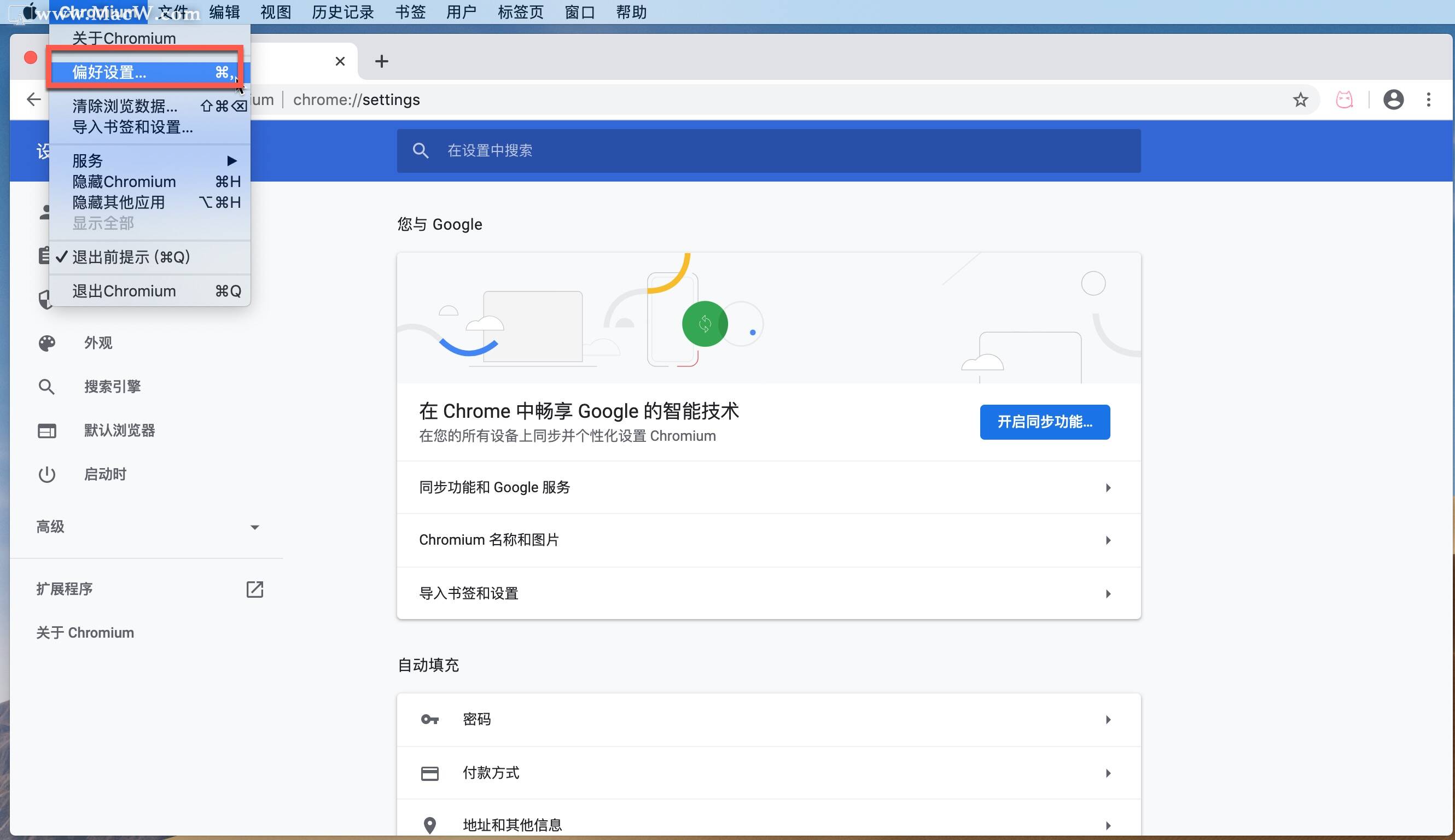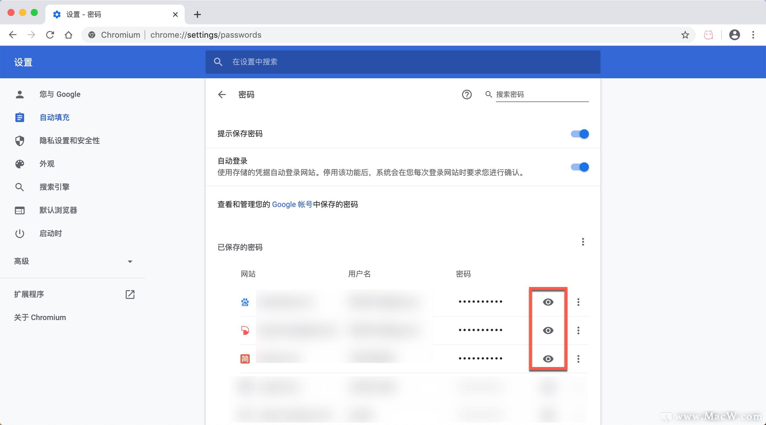 我们以Chrome浏览器为例。打开Chrome浏览器的偏好设置,点击左侧边栏的自动填充,在右方选择密码选项即可进入到网站账号和密码的保存页面,你可以在下方列表找到你需要查看的网站,也可以通过右上角搜索,找到网站和对应的账户记录,点击密码右侧的眼睛图标,验证完系统密码后,即可显示网站以及用用户名对应的密码。